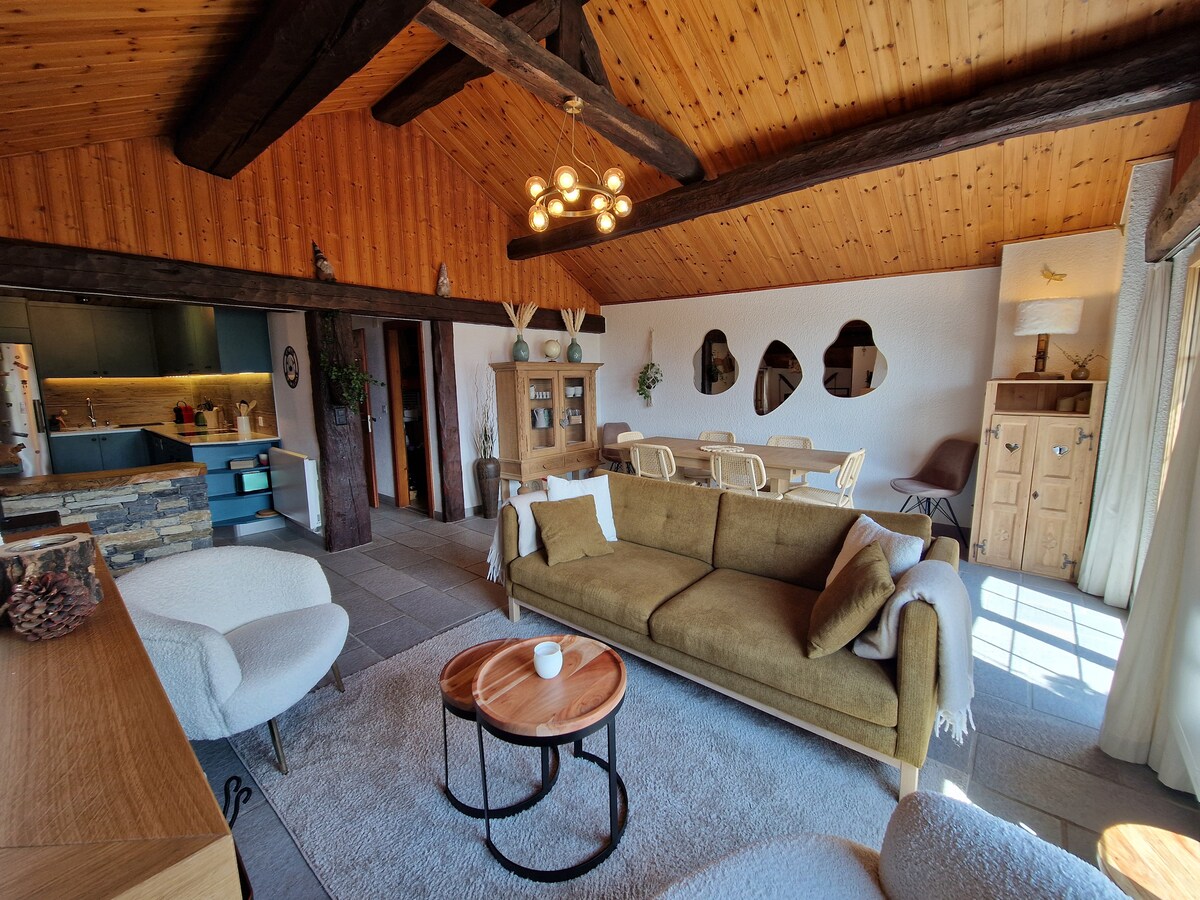 歡迎狗狗入住。🐶 提供免費 Tesla 充電器。 P 'tit Chalet 位於克朗-蒙塔納 (Crans-Montana) 度假村的門口,是一個獨特的住宿地點。 這間 35 平方公尺的獨立套房裝潢精美,散發著度假與寧靜的氛圍。我們在那裡感覺很好。 大型私人露臺配有燒烤設備,讓您放鬆身心。 我們為您提供自製果醬和一小瓶當地葡萄酒。