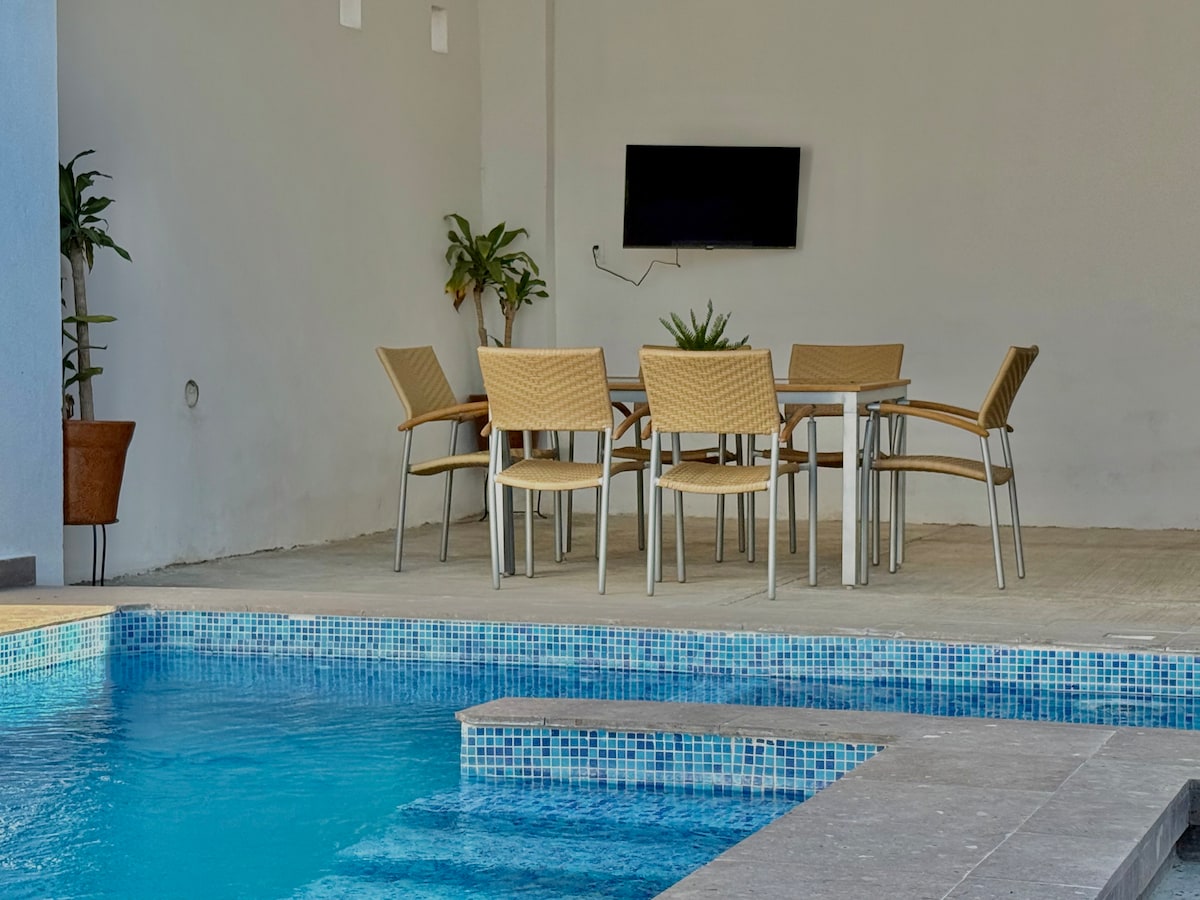 「在私密、安靜和安全的街區放鬆身心。 享受泳池、綠色區域。 您的理想住宿體驗正等著您!」 我們有4間房間可供選擇,房間的開放取決於旅人的數量 🚨備註。 🚨 泳池供分區使用,您和您的客人每天可以使用3小時。它是獨家使用的,沒有其他人進入。 如要使用泳池,請務必查看預訂狀況並提前預訂