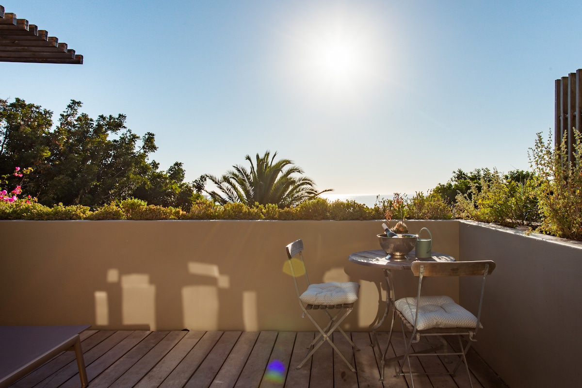 A former art studio has been converted into a beautiful little home that is attached to main house with panoramic valley view from your bed and garden. Further up in the mountain of Kronenzicht in a quiet cul-de-saq you can unsettle while having a dip in your private and heated hot tub, relax under the rain shower with stunning views on the back of table mountain and little lionshead or start your sunset walk on the beautiful sand dunes next to our property, even all the way down to Sandy Bay.