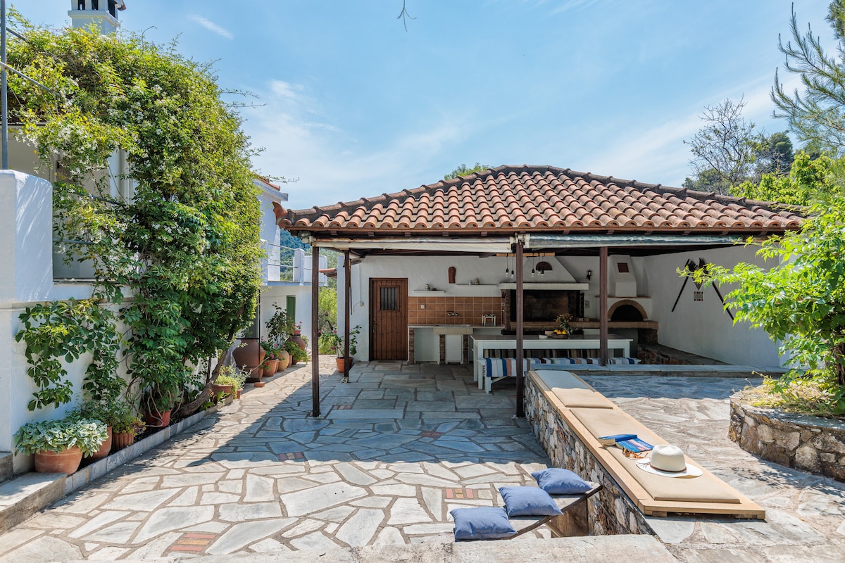 全面翻新的斯科佩洛斯風格的房子,融入大自然! Ambeli別墅距離斯科佩洛斯島中心7公里,位於小鎮上方的綠色懸崖頂端。 一個安靜的街區,您可以在這裡享受斯科佩洛斯島的自然魔力,並且可以輕鬆前往島上幾乎所有的海灘(開車)。 別墅包括2間臥室,一間配有雙人床,另一間配有2張單人床,兩間全新的浴室和一個以傳統風格裝飾的客廳-廚房區域。
