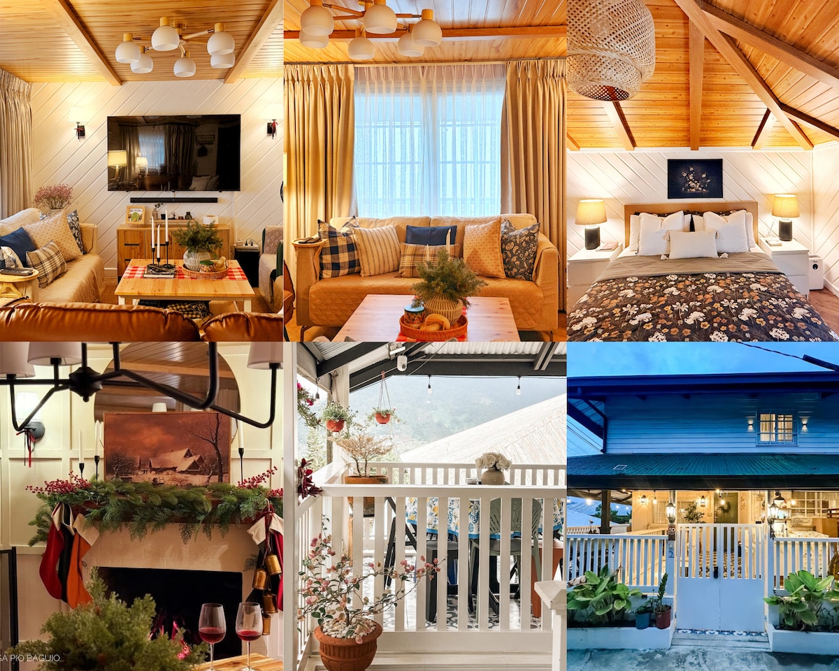 在這個舒適、時尚和迷人的房源中享受山景和清新的空氣,距離餐廳和景點(如Camp John Hay、Mines View Park、The Mansion House等)10分鐘。此房源適合家庭和一群好友入住,可攜帶寵物和輪椅,提供室內壁爐、2個戶外火坑、4間帶浴室的臥室、全功能廚房、戶外用餐、前院和後院;有線電視、卡拉OK機和高速網路,適合希望在家工作的人。