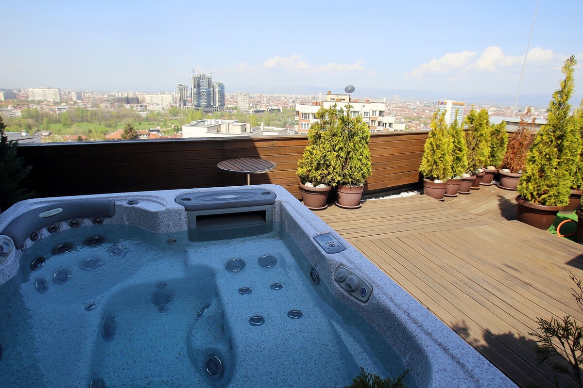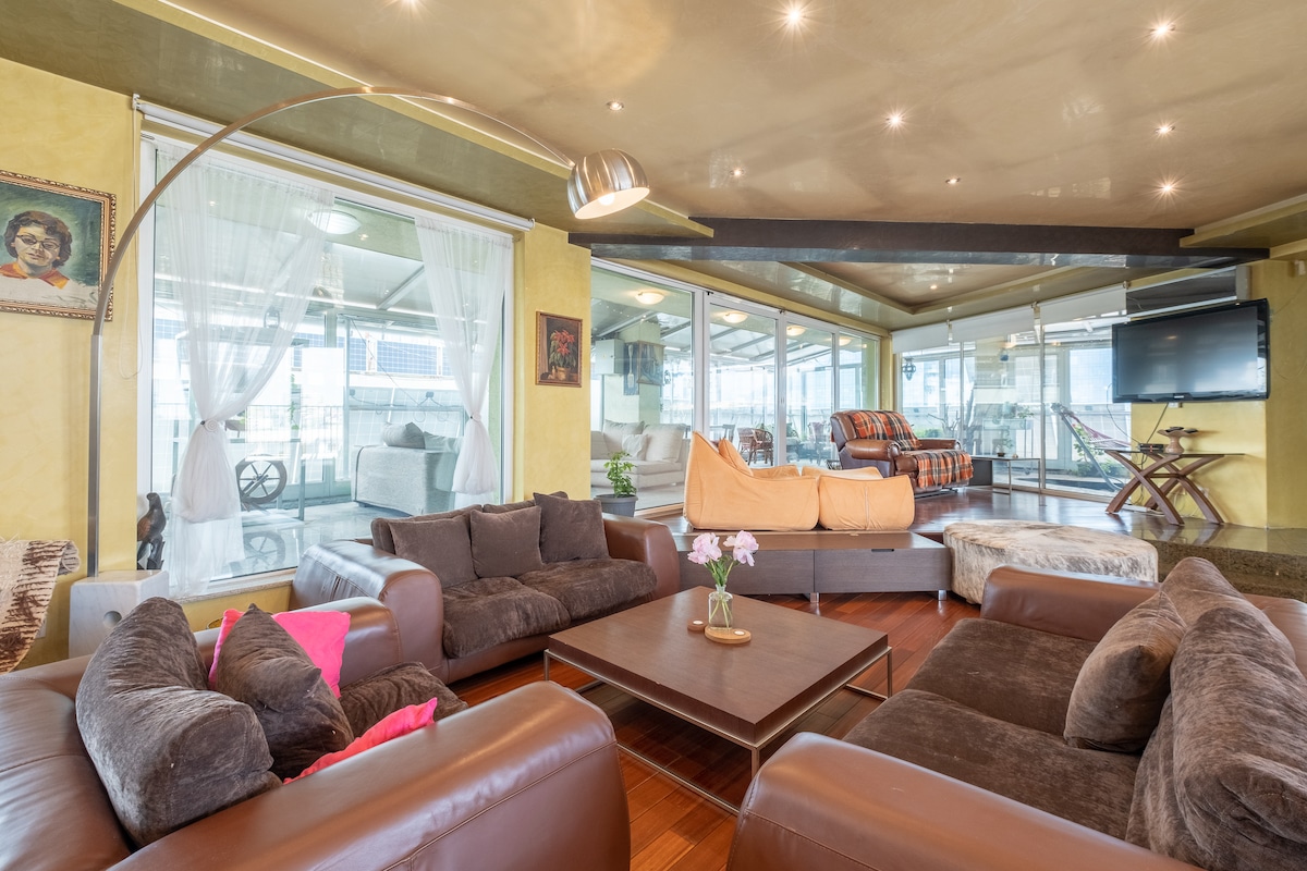 入住索非亞,享受全景4臥室頂層公寓的優雅和空間。 精心裝潢,設有陽光明媚的早晨、按摩浴缸、室內和室外陽臺,可從所有臥室進入。 入住期間,您無需步行超過一個街區即可找到您正在尋找的東西。 頂層公寓不到3分鐘即可抵達藥店、超市、家庭商店、商場、健身房、計程車等。