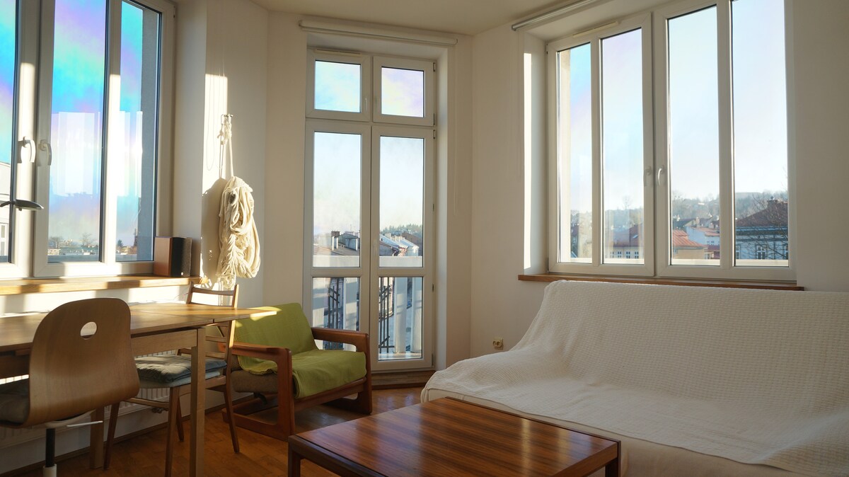 A bright and spacious 1-bedroom apartment in the heart of Przemyśl with a fantastic view of the old town. Situated in a traditional neighborhood, just a 3-minute walk from the train and bus stations, and close to the main market square and charming town park, this apartment is perfect for professionals and holidaymakers. It also provides a comfortable space for demanding guests to work remotely.