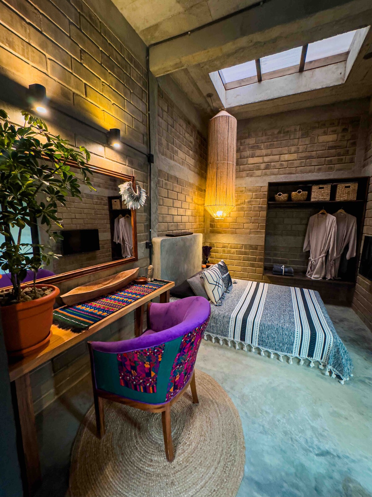 This refined room captures the essence of contemporary architectural elegance. It features clean lines, an expansive glass window overlooking the lake and three volcanoes, a spacious rooftop terrace, and meticulous attention to detail. Situated just 20 meters from the lake shore amid private gardens with endless lake views, it offers a serene and stylish retreat. We provide breakfast upon reservation for an additional fee of Q200/$25 per person and a 15% service charge.