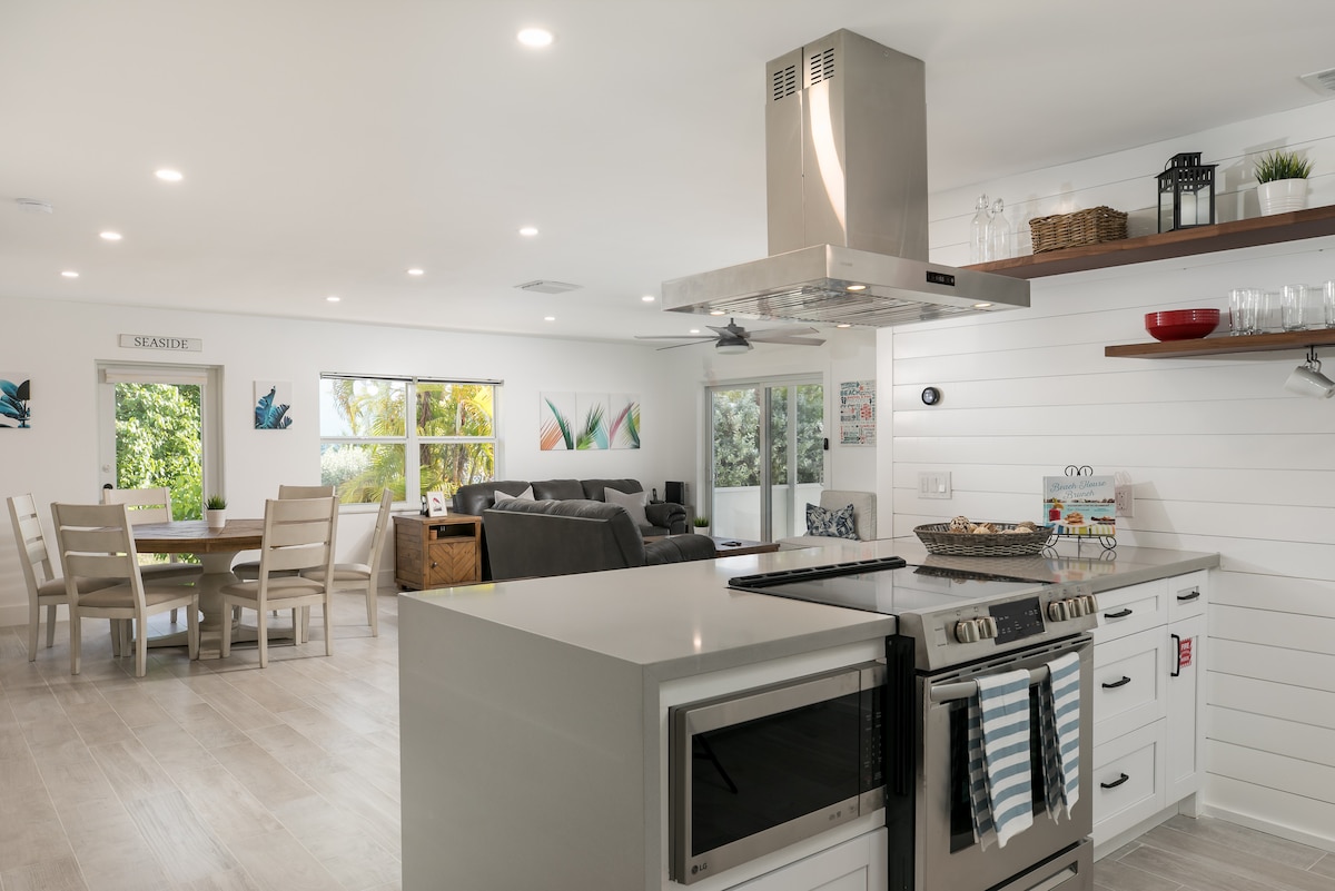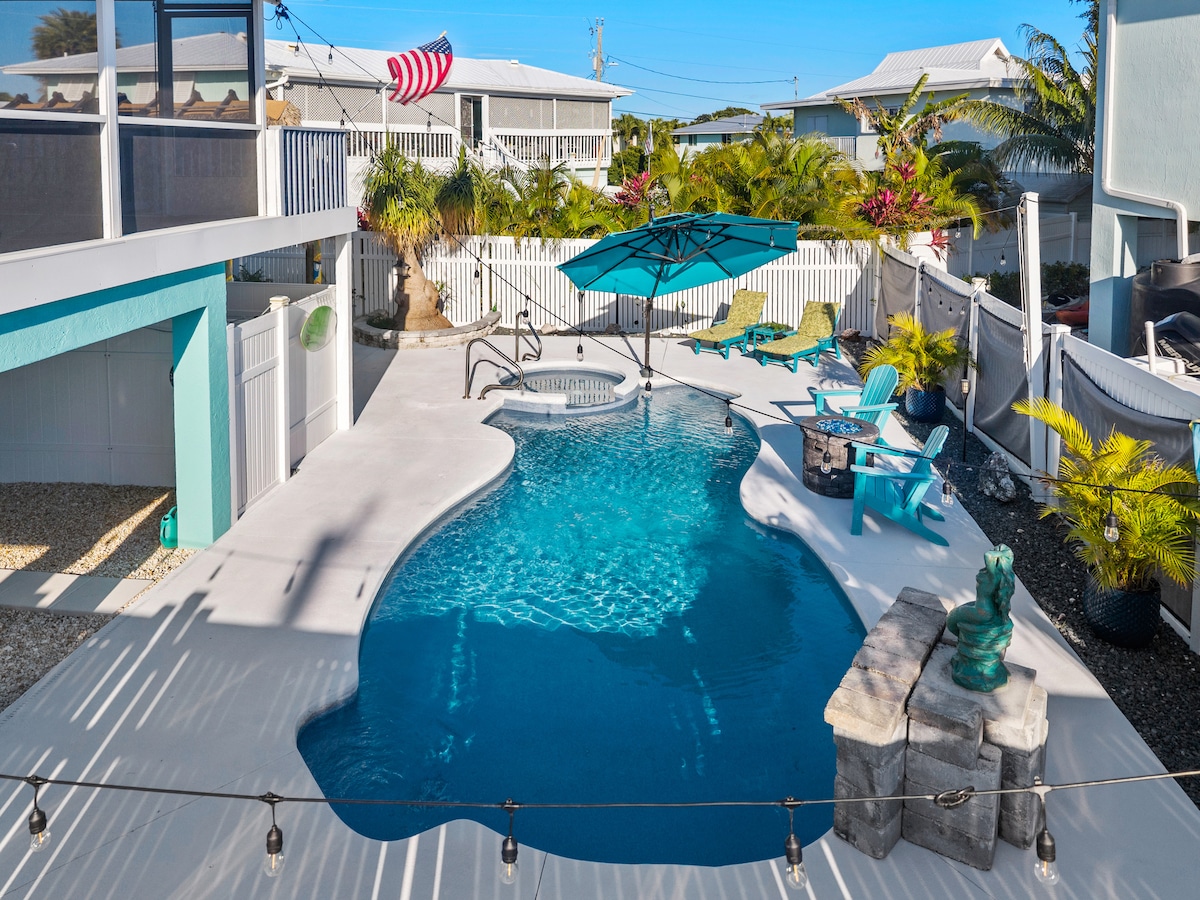 在我們的4間臥室、3間浴室別墅中醒來,欣賞令人驚嘆的水景。享受1800平方英尺的佈局、設備齊全的廚房、不鏽鋼電器和花崗岩檯面。可入住 10 人,配有記憶海綿床。 在室外,您可以在私人溫水泳池(冬季)和提基遮蔭區放鬆身心。從32英尺碼頭釣魚或使用燃氣燒烤架。包括2艘皮艇、2個槳板和4輛成人自行車,可騎車5分鐘前往Sombrero海灘。 室外監視錄影器。度假許可證#VACA-22-40。立即預訂!