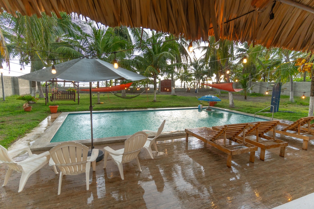 在這間寧靜的海景房與家人一起放鬆身心。醒來欣賞迷人的日出,然後坐在泳池旁觀賞日落。 享受新鮮的椰子,感受海風,同時享受陽光。Barra de Santiago地理位置獨特,距離令人驚嘆的bocana僅幾分鐘路程,四周環繞著數英里的紅樹林。 房源距離一個可愛的小鎮不遠,有許多餐廳和當地市場,非常適合在我們設備齊全的廚房中烹飪家常菜餚。