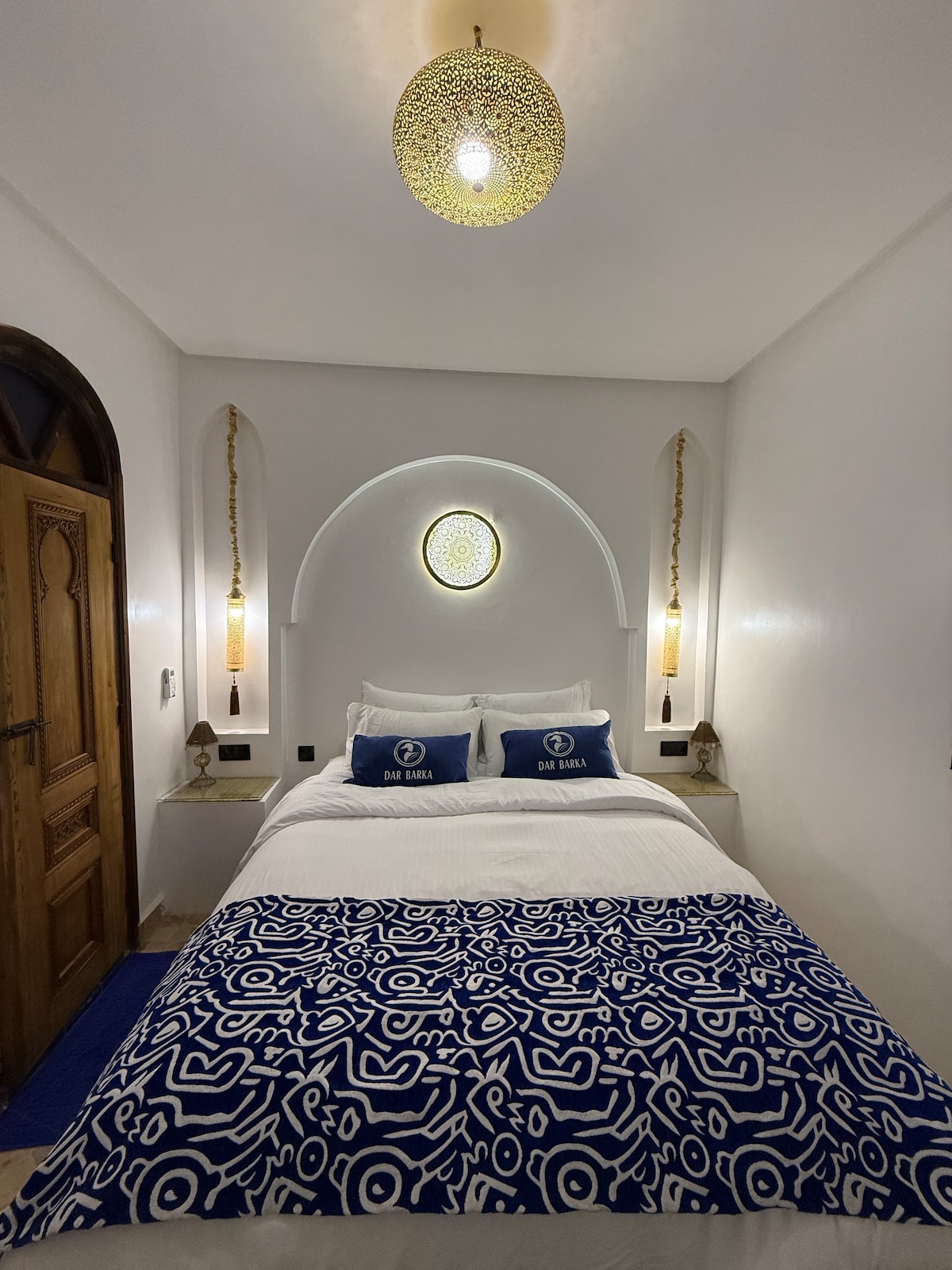 Vous ne voudrez plus quitter ce logement cha客房擁有迷人、柏柏爾風格的美學,兩張雙人牀裝飾著充滿活力的紡織品。 這些手工製作的複雜圖案面料不僅增添了溫馨迷人的氛圍,還展現了當地社區非凡的藝術和工藝。 大窗戶充滿自然光,營造出明亮通風的氛圍。