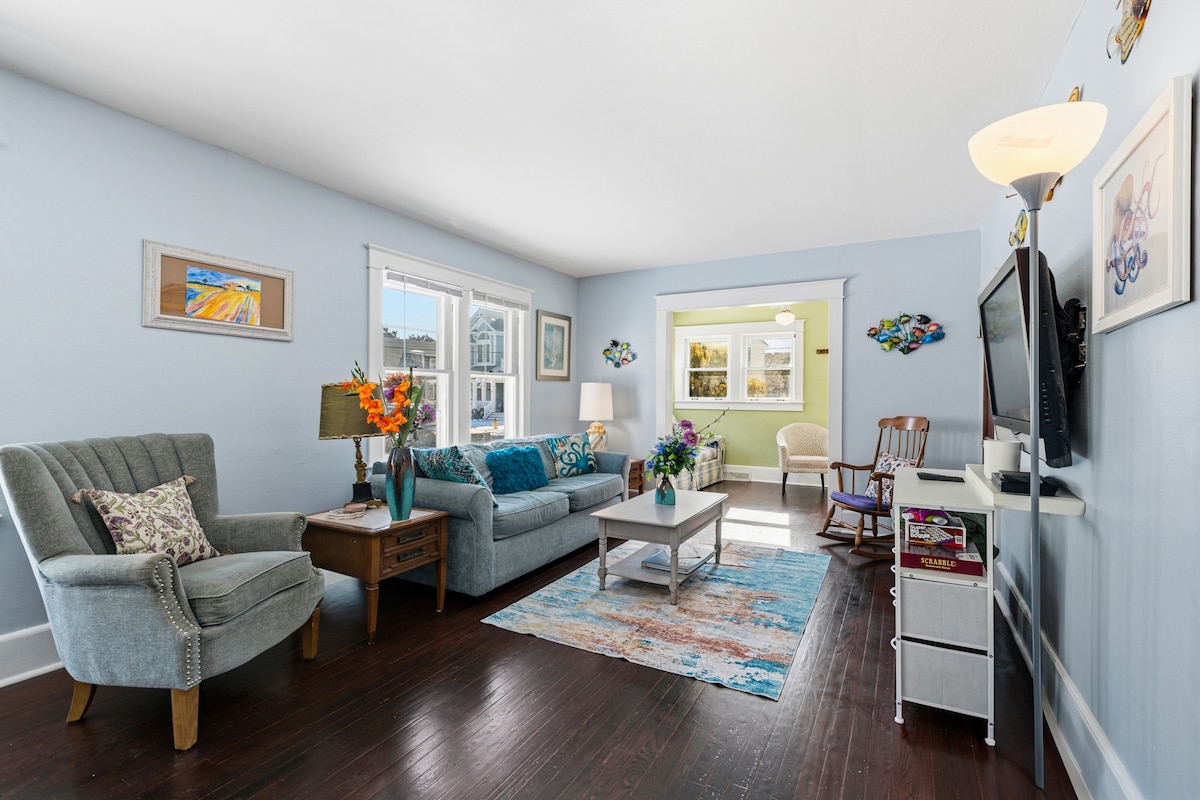 Welcome to Sunlit Surf Haven! A newly renovated entire home (2024) - ocean-block in Midtown Ocean City. Ride the coastal vibe in this bright surf-inspired retreat that sleeps 6 with two large beds and bunk beds. Enjoy on-site parking (2 spots) plus street parking, and beach gear included - chairs, umbrella, cooler, and blankets - for effortless beach days. Walk to shops, mini golf, and favorites like The Bonfire, Hooked, Bayside Skillet, OCM Crabs, and Ropewalk - just steps from the sand.