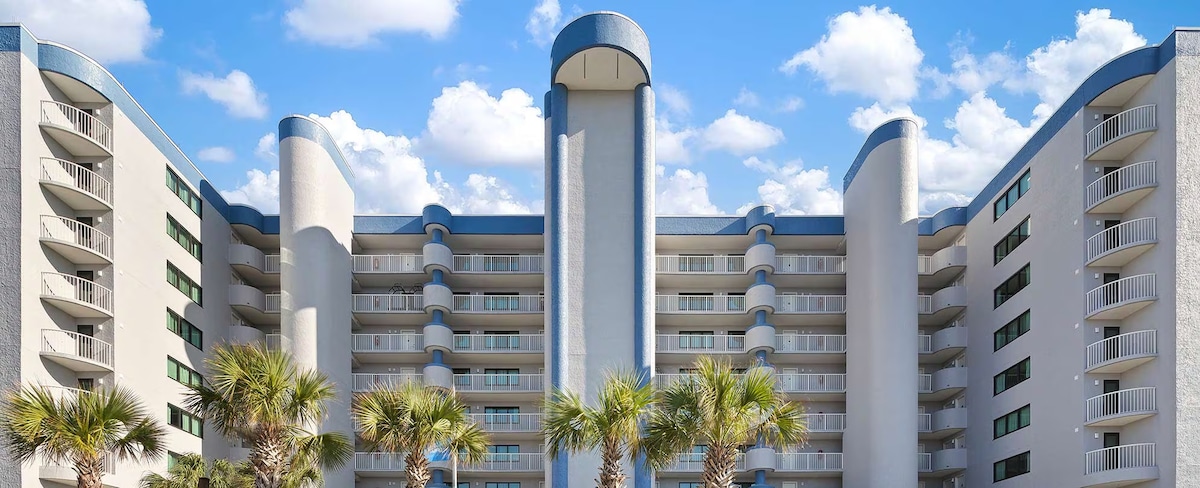 STARBUCKS ON SITE!!😎 Self check in, Ground floor condo so no waiting for elevators etc. located @ Grand Cayman Oceanfront Resort beautiful decorated sleeps 4 with a comfy king bed and queen sofa sleeper, south side ocean view an efficiency kitchen, smart TV. Indoor parking, pools/hot tubs/ lazyriver/ beach just steps from the room. The resort has a 4 story waterslide, tiki bar, breakfast buffet and the famous River City Bar & Grill next to the resort is voted best hamburgers on the beach