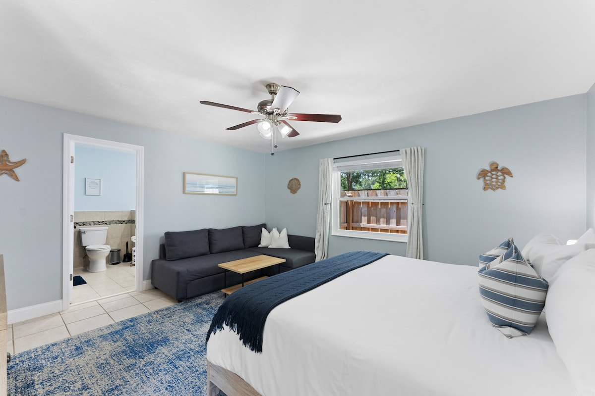 這間私人的寧靜客用套房位於無與倫比的中心位置!—非常適合海灘遊客和衝浪者、賽車狂熱者和購物狂人參觀國際賽車場、新士麥那海灘愛好者,以及那些只是想看看看新度假勝地的人!這間美麗的客用套房包括一個大型浴室,配有全尺寸噴射浴缸、一張加大雙人床和55英寸平板電視、一個可愛舒適的早餐角落,以及一個私人入口,讓您享有完全的隱私!