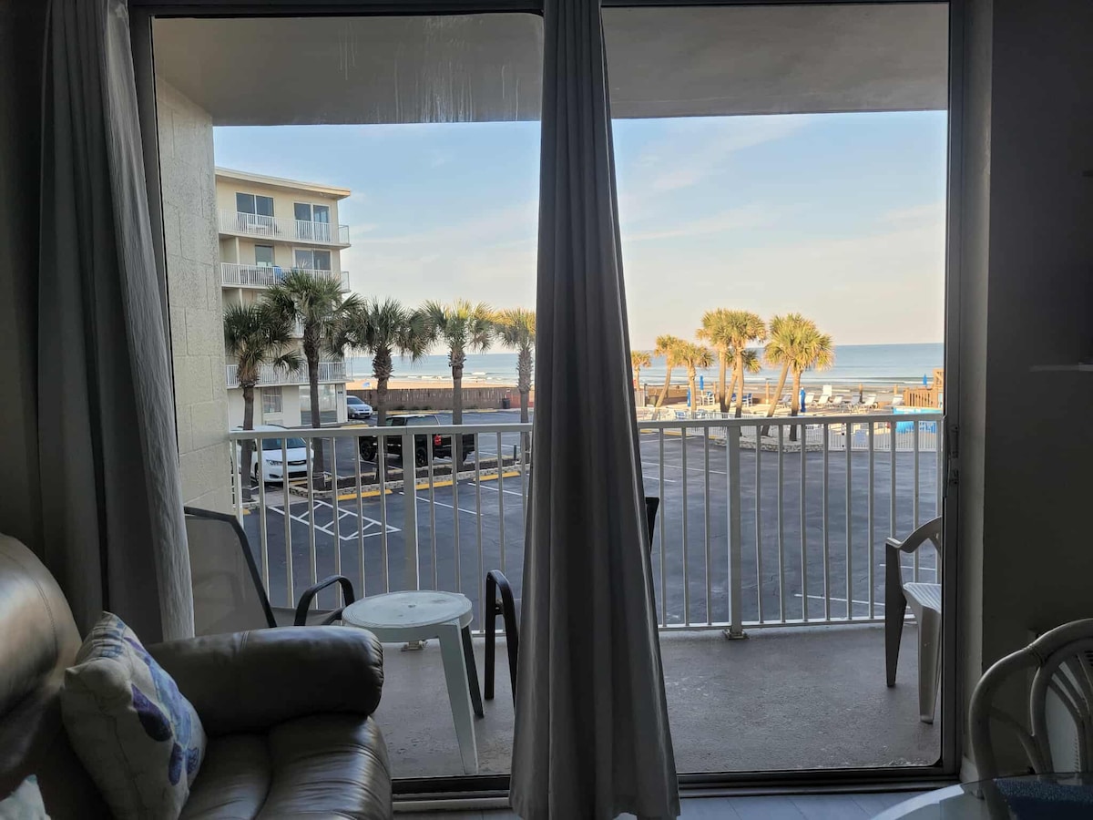 泳池現已開放! ! 戴托納海灘海濱單間公寓,可欣賞大西洋的美景。 設備齊全的廚房、製冰機、大水槽、微波爐、電磁爐和電烤盤(在櫥櫃內),咖啡吧距離著名的代托納海灘木板路(Daytona Beach Boardwalk)僅1.5英里。 提供50吋Roku電視、遊戲和海灘用品。 2張床可睡4人,配有Serta床墊的大床和配有凝膠泡綿床墊的全尺寸沙發床。 大廈正在進行颶風損壞的重建工作。