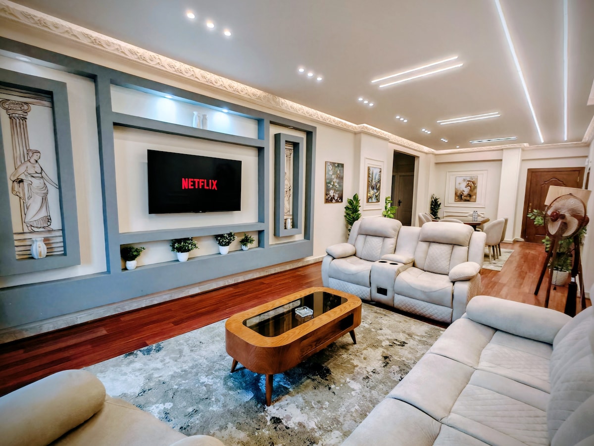 坐在舒適的沙發上,享受55英寸三星電視和快速網路。 它位於新開羅最好的門禁社區之一。距離機場約30分鐘。 步行即可抵達商場和AUC。它位於 Village Gate 區。靠近90號商場。靠近超市、電影院、商店、Paul和高級餐廳。 距離金字塔約42公里。