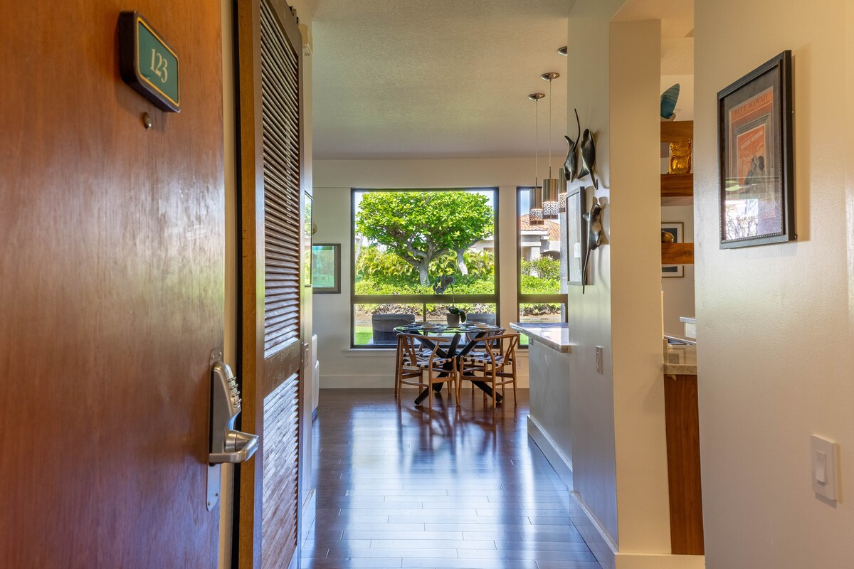 Enjoy your stay at this serene ground floor, remodeled in 2023, 1 bedroom 1 bath corner unit condominium in one of the best location of Waikoloa Beach Resort. * Lush tropical landscaping with ponds and waterfalls * Next to pool, tennis court, BBQ and fitness center * Walk to beach, shops, restaurants, entertainments and Grand Hilton * Free fast WiFi. Central A/C. Washer and dryer. * Spectrum Cable and Roku streaming TVs * Private Parking spot 50 yards from the front door