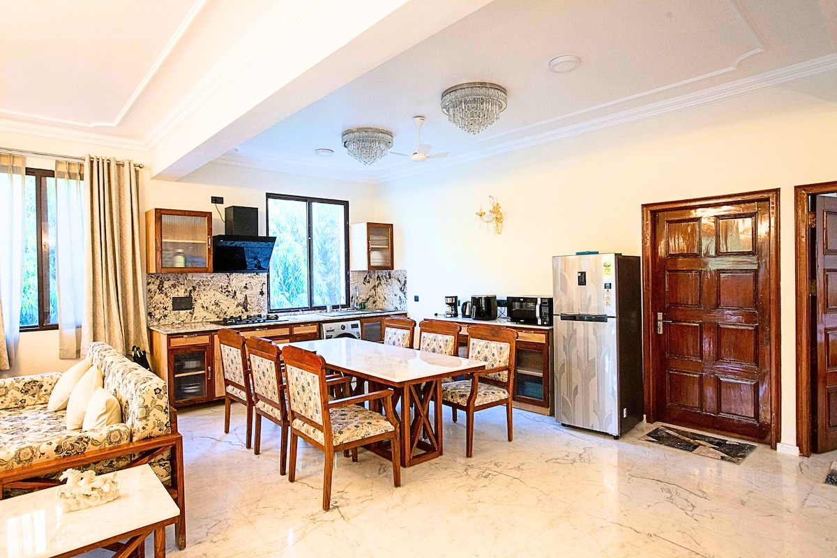注意:在旺季,住宿會很快被預訂! 在這間精緻的南德里3居室樓層的獨立房屋中體驗無與倫比的奢華,位於獨家和有門禁的Sainik Farms,靠近商場和Saket地鐵站。 定制義大利大理石地板、手工家具和帶私人陽臺的寬敞臥室。 在配備浴缸、AI空調、設備齊全的模組化廚房和寧靜的戶外空間的水療浴室放鬆身心。
