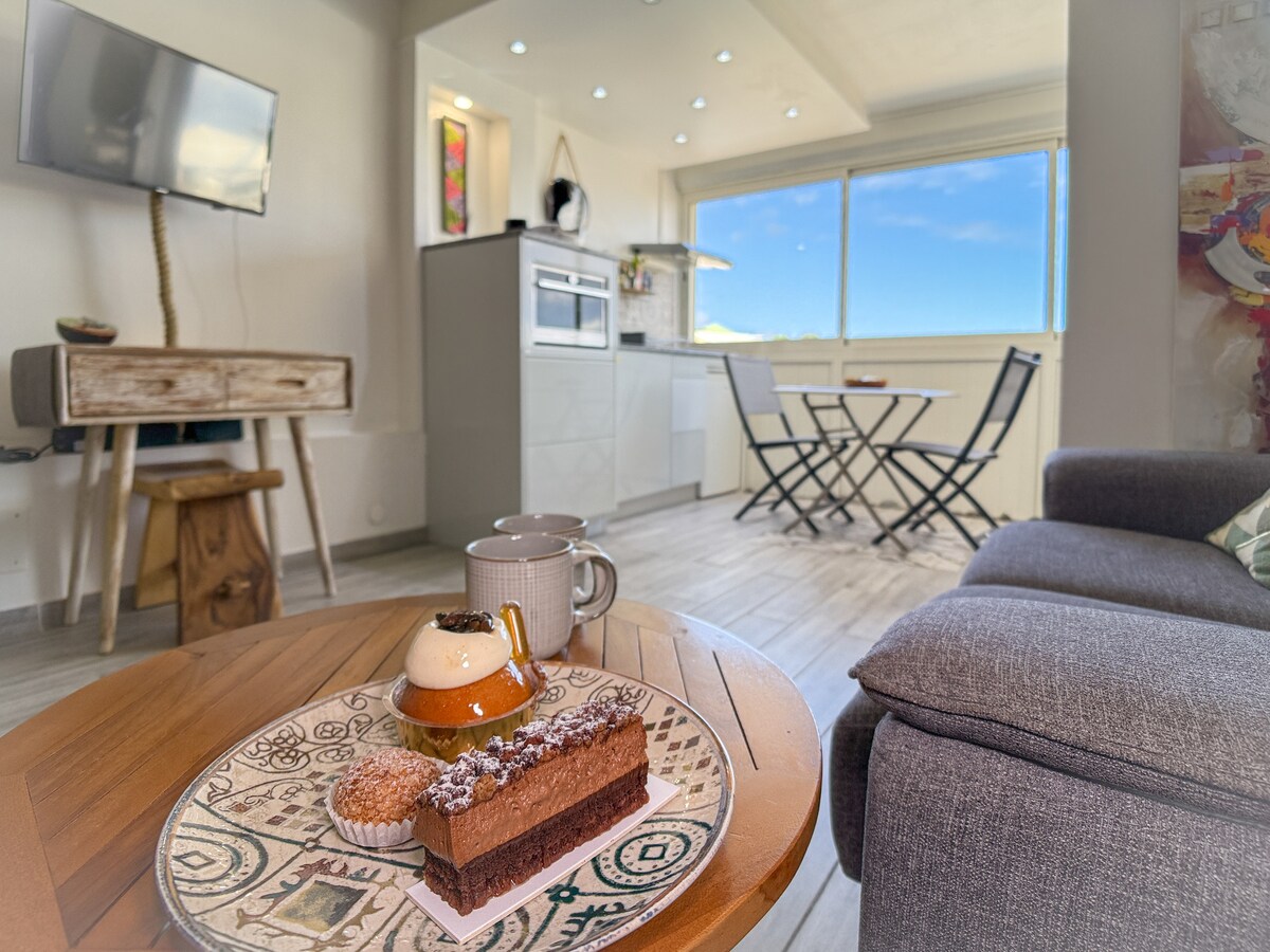 優雅的2房公寓,可欣賞海景🌊,面向郵輪碼頭🚢,步行15分鐘即可抵達渡輪碼頭,前往瑪麗加蘭特島、多米尼克、馬丁尼克和聖露西亞。 非常適合情侶、中途停留的旅客或商務住宿。 靠近ACTe紀念館、許多熱鬧的餐廳和酒吧,距離Le Gosier的天堂海灘(如Datcha)僅10分鐘車程。