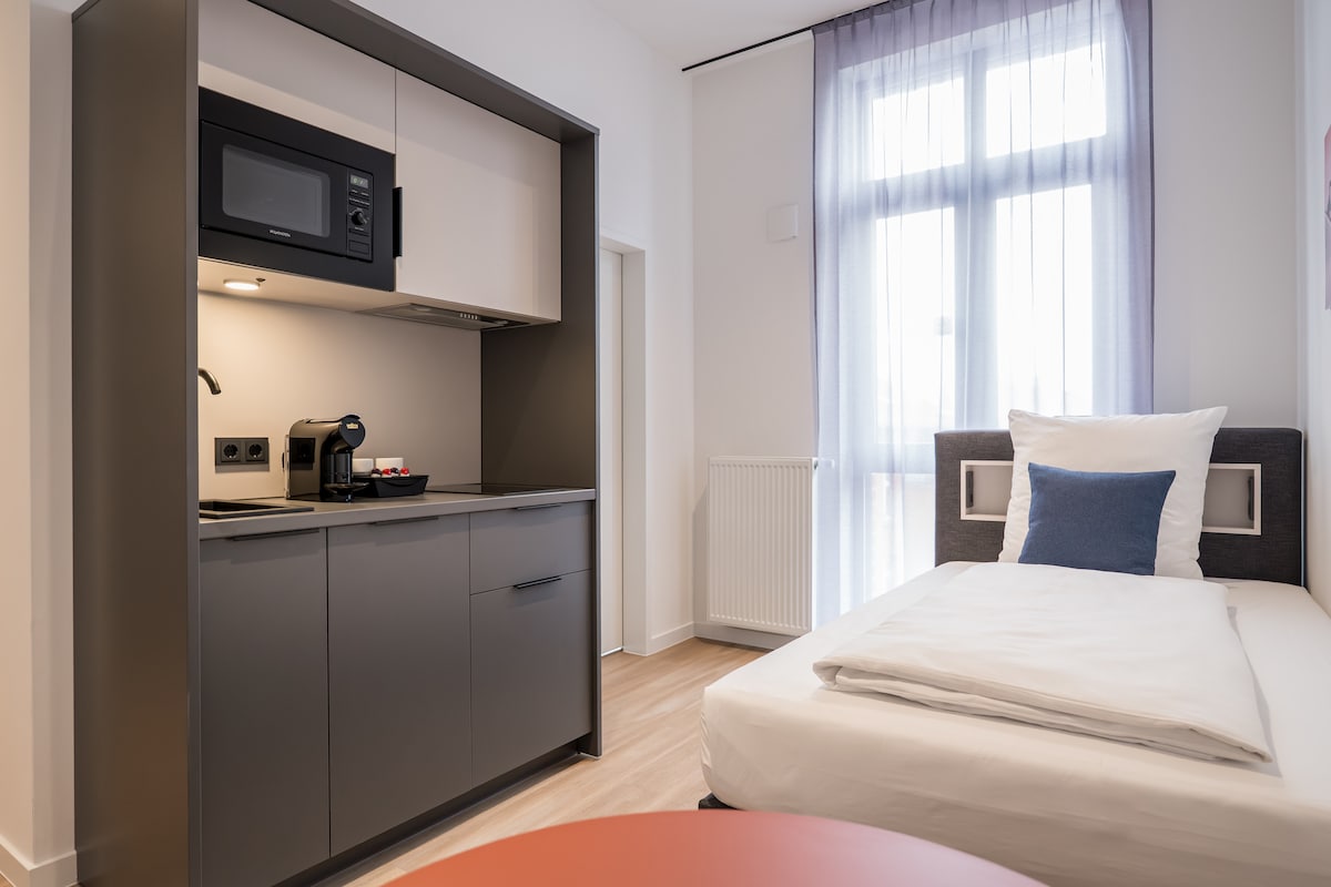 Die Single Studios sind 18 m² groß und mit einem praktischen Interieur gestaltet. Sie verfügen über ein Einzelbett (120x200), einen Flachbild-TV und kostenfreies WLAN. Die Küchenzeile ist vollständig ausgestattet mit Mikrowelle, Geschirrspüler, Kühlschrank, Kochfeld, Kapsel-Kaffeemaschine und allen wichtigen Kochutensilien. Das Badezimmer bietet eine Dusche, Toilette und einen Haartrockner sowie kostenfreie Pflegeprodukte.