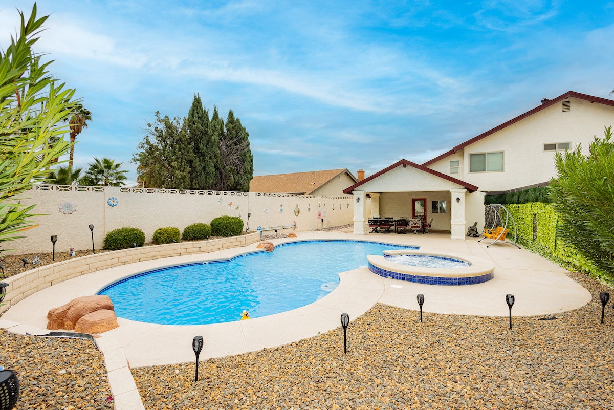 Welcome to our most enjoyable four bedroom house with a private pool and jacuzzi in the heart of Las Vegas! This relaxed vacation rental is perfect for families, groups of friends, or business travelers with our verified wi-fi looking for a comfortable and stylish stay in Sin City. Included for you we have a full size pool table, ping pong table, pool basketball, cornhole, ladder golf. $50 / day to heat the pool. $25 / day to heat the hottub.