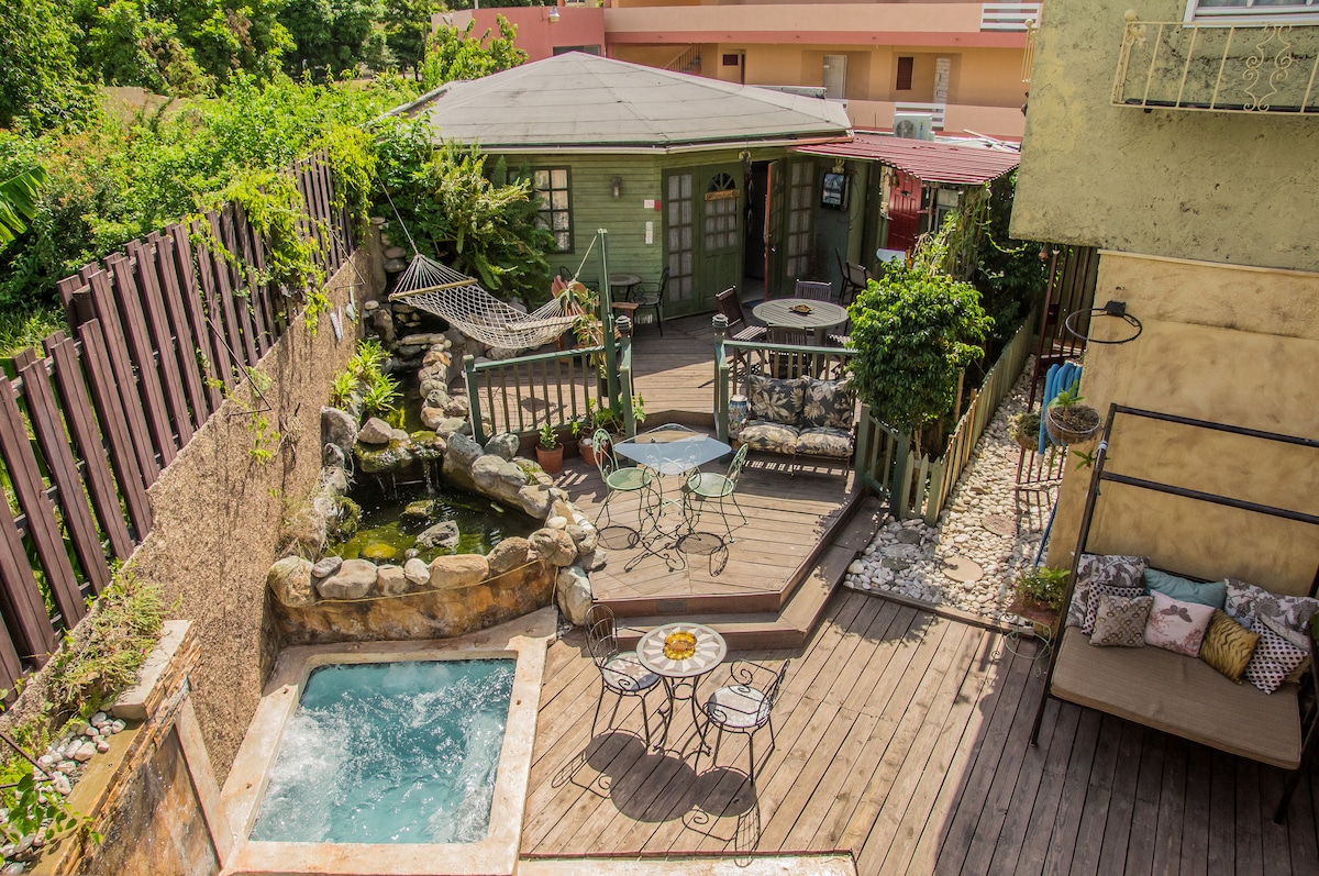 A quaint and tastefully designed space ideal for lovers and singles. Conveniently located in the heart of Kingston city. Step out of your room into the bubbling hot tub (charges apply) or just sit by the pool. Enjoy a cold beer from our on-property bar or order from our 5 star international menu. If you like rustic comfort then this is the place for you. Close to major attractions, shopping, restaurants, museums and nature.