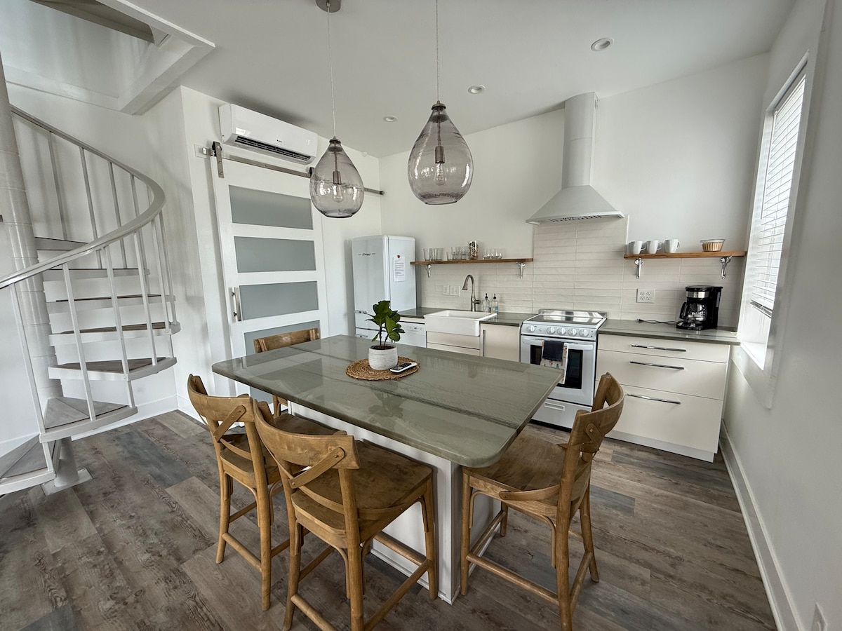 Over 100 years old, this was originally a mechanics garage used to repair cars racing the beach. Now it’s a lovely two bedroom retreat. Just steps from the ocean and in the middle of all that St Augustine Beach has to offer. Whether you are enjoying the view of the ocean off the master bedroom deck or relaxing after a day at the beach this will be your home away from home. This apartment has two bedrooms and one bath on the upper level, the full kitchen and living space is downstairs.