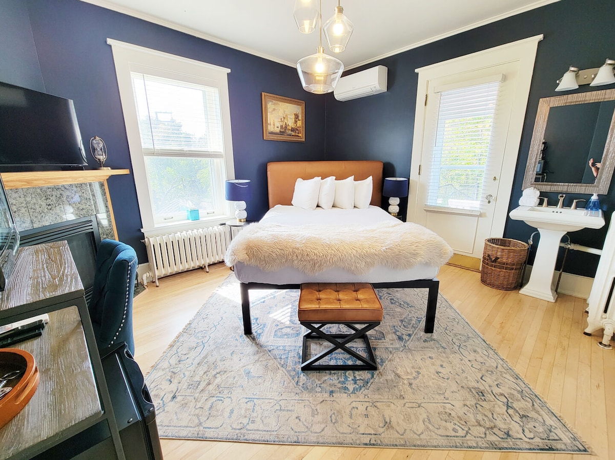 Bask in the sun-soaked elegance of this 3rd-floor, 1200sqft luxury apartment in Duluth, blending historic charm with modern luxury. Originally a grand ballroom and staff quarters, this 2-bedroom retreat boasts stunning morning sunrises over Lake Superior and vibrant evening sunsets from your private balcony. Enjoy two king-size beds, a twin daybed, a fully equipped kitchen, two cozy fireplaces, a Smart TV, and more.