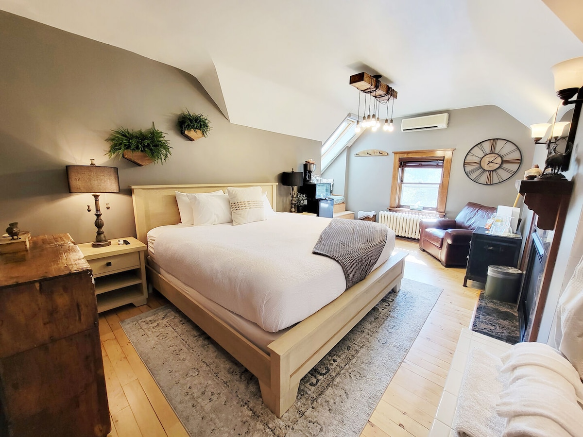 The General Mills Suite is a third floor walk up with views of the trees and the creek below. The cozy king size bed and oversized plush leather chair you can relax and let all your cares melt away. The room includes a Samsung Picture Frame SmartTV with Netflix access, a reading nook, a gas fireplace, jetted tub, refrigerator, microwave, and coffee maker. This property is intended for adult getaways, no persons under the age of 16 are permitted.