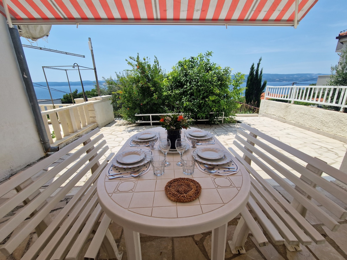 這間美麗的公寓最多可容納5人,是您度假的完美門戶。公寓位於房屋的頂樓,可欣賞迷人的海景,舒適的陽臺,配有桌子和6張椅子。兩間配有雙人床的房間和客廳內的額外睡覺空間,最多可供5人入住。房子旁邊有令人驚嘆的泳池,專供您無限制使用(私人),您可以直接從無邊際泳池欣賞周圍最佳的海景。