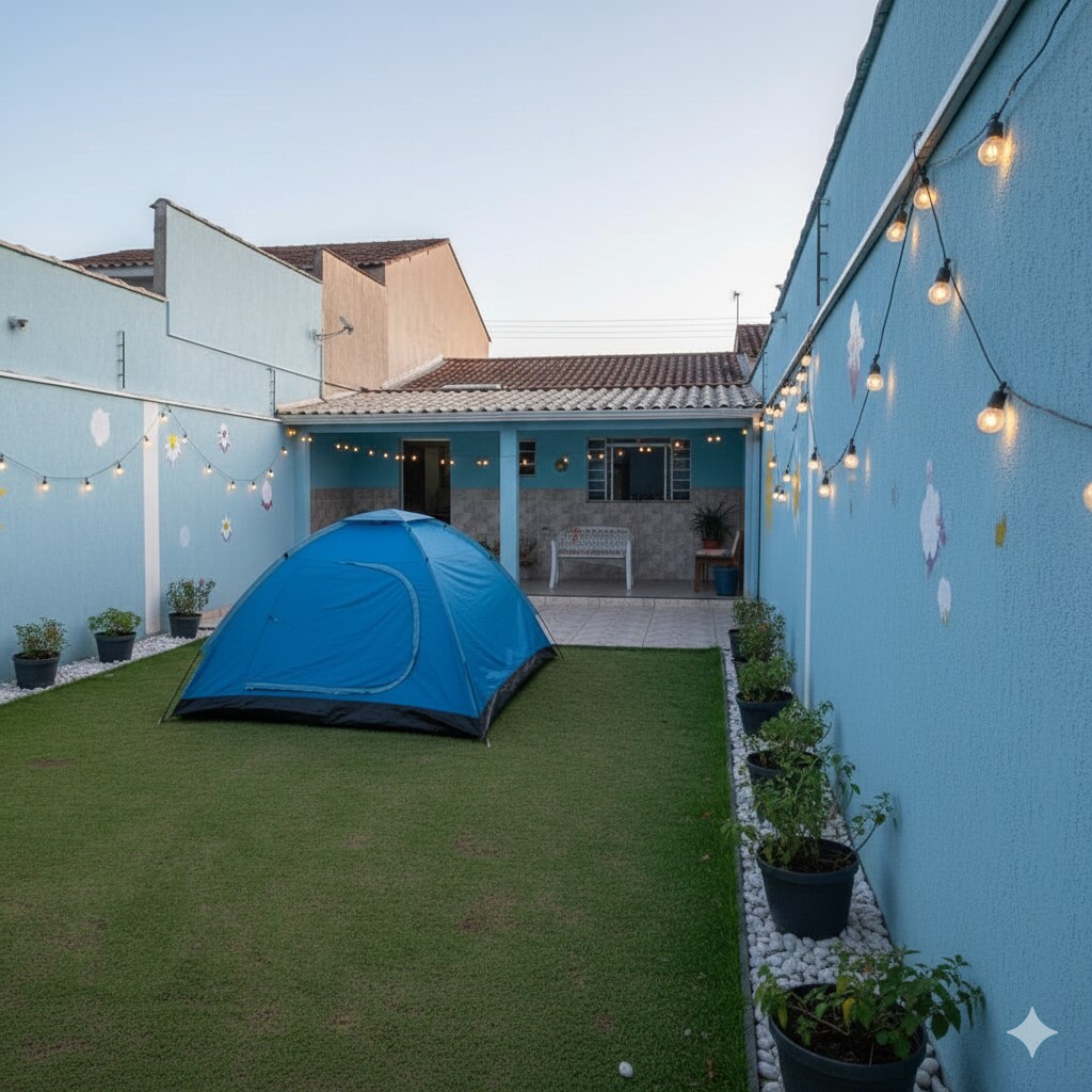 Barraca na área externa e coberta da nossa casa. O hóspede terá acesso a sala, cozinha e banheiro da casa, podendo usufruir desses cômodos.