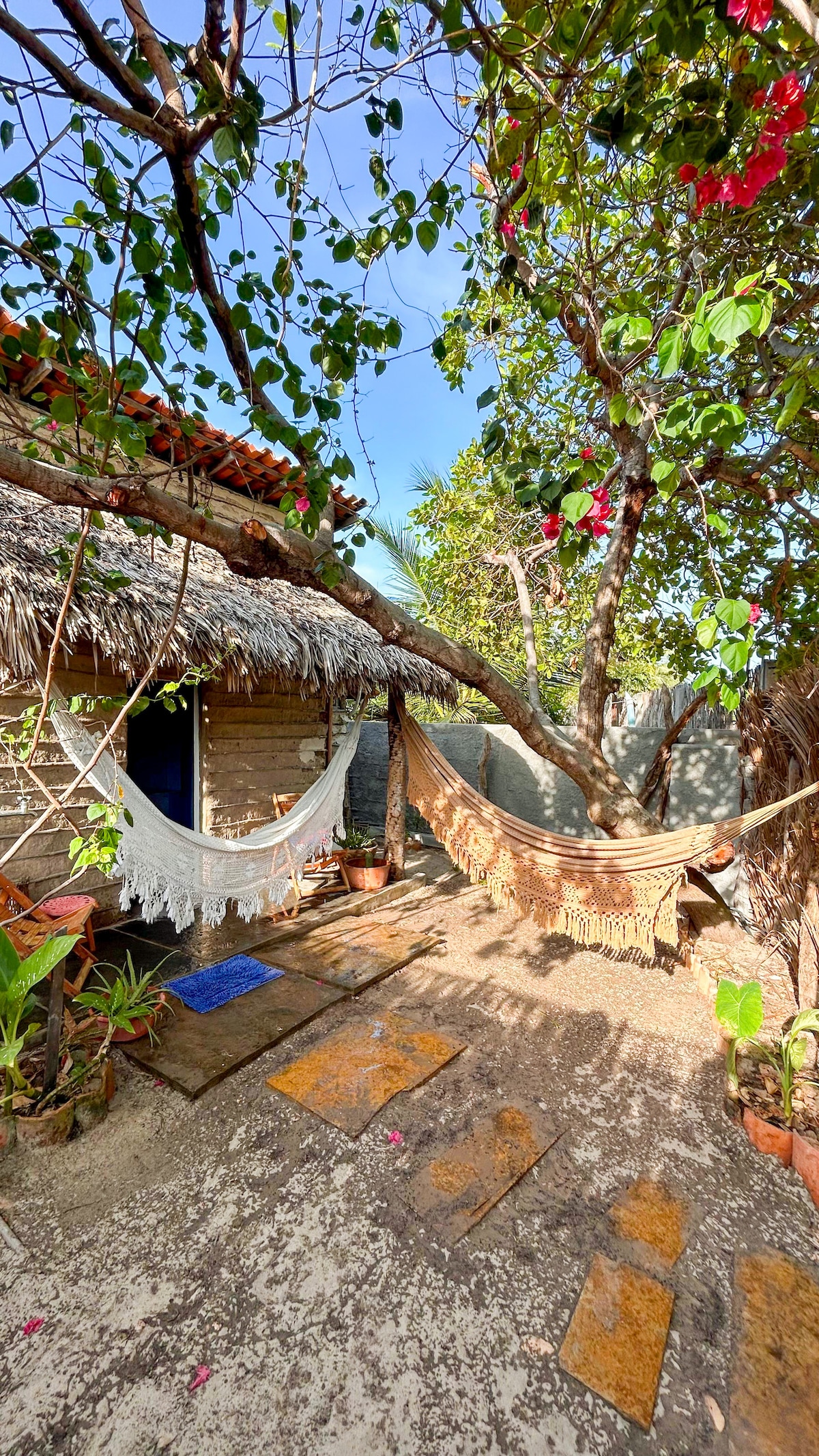 Enjoy the coziness of Casa Carnaúba's ecological suite! A beautiful natural adobe construction, with natural thermal insulation and surrounded by all the nature of this paradise that is Atins. We are located on the Main Street of the Village, just minutes from Atins beach. The room is airy and has a private balcony with a hammock, minibar, wall fan, semi-open bathroom and space to eat and work.