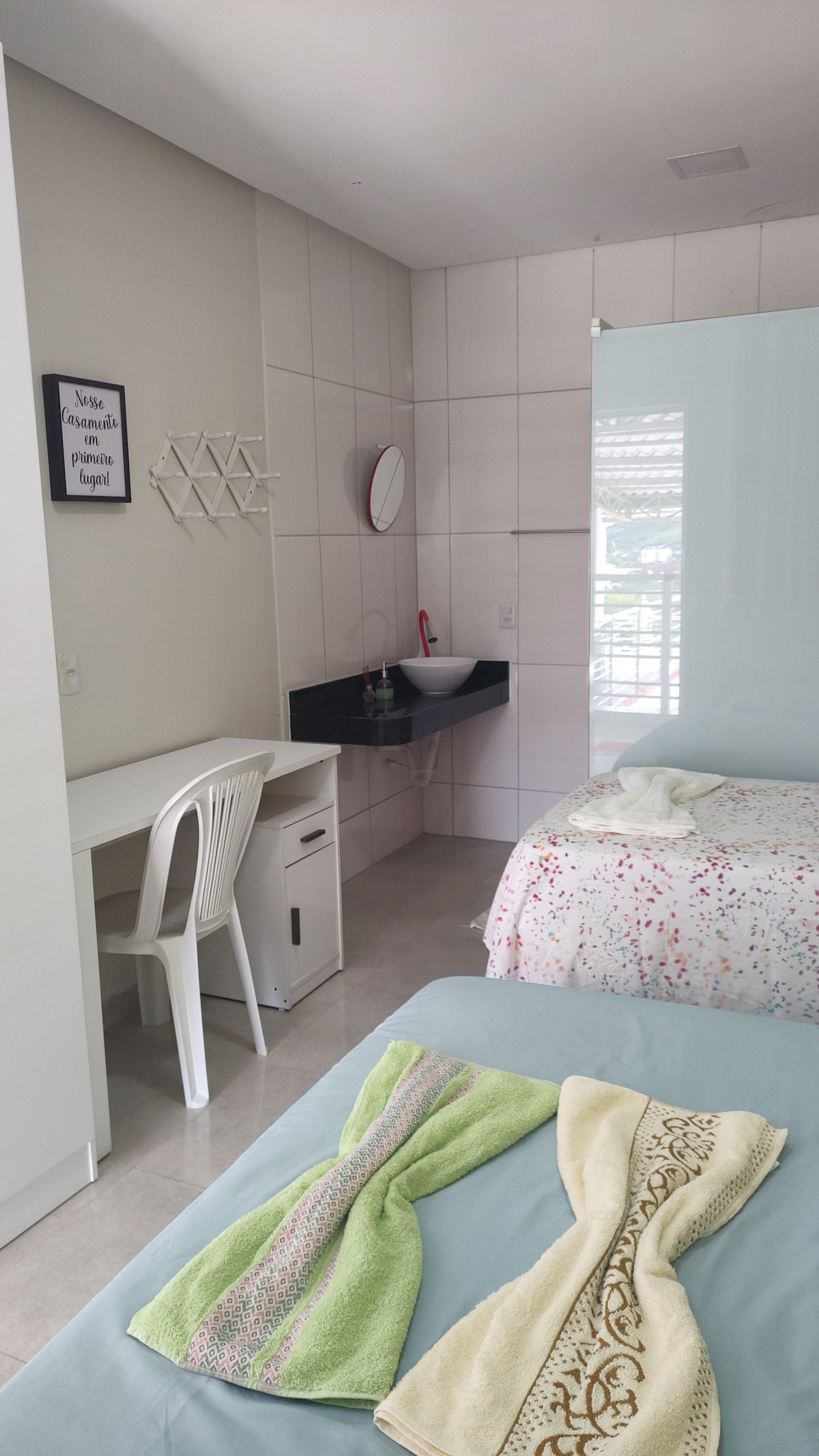 Kitnet independente em imóvel residencial no bairro do Bessa, em João Pessoa. As duas kitnets ficam lado a lado em área que era o quintal da casa. Cada unidade tem porta própria e espaço privativo. Conta com cama de casal, ar-condicionado, frigobar, fogão elétrico, chuveiro elétrico e Smart TV. O quintal, Wi-Fi, máquina de lavar, micro-ondas e cafeteiras são compartilhados. Não há vaga para carro. Moto pode ser estacionada no quintal, conforme disponibilidade.