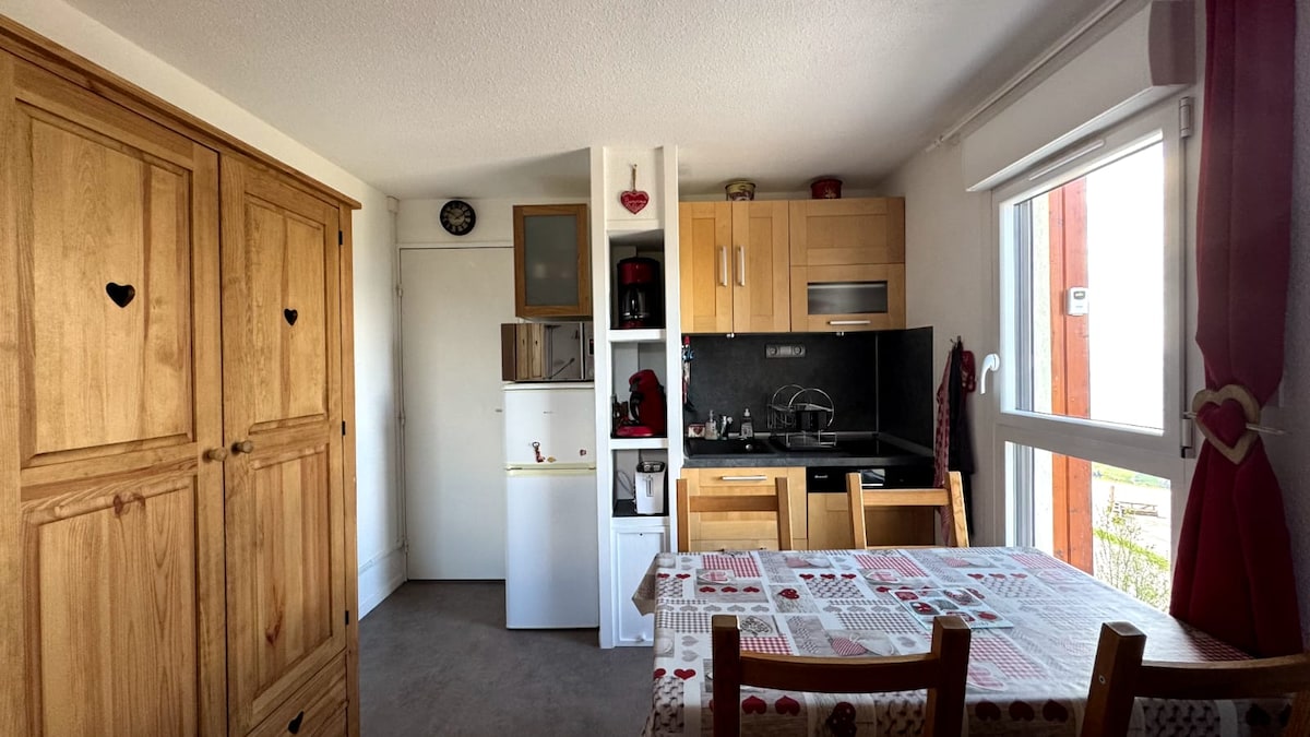 Perfect location (residence Edelweiss ) between the ski school (winter) , the pool area (summer) and the mall. - View on the slopes - With balcony - 3rd floor - Departure and return to the residence skis (or mountain biking in the summer) - Living room : 1 double bed, 1 single bed , 1 sofa bed, TV with DVD player, radio. - Fitted kitchenette with fridge, ceramic hob, sink, oven, microwave, coffee maker (classical), toaster, raclette.
