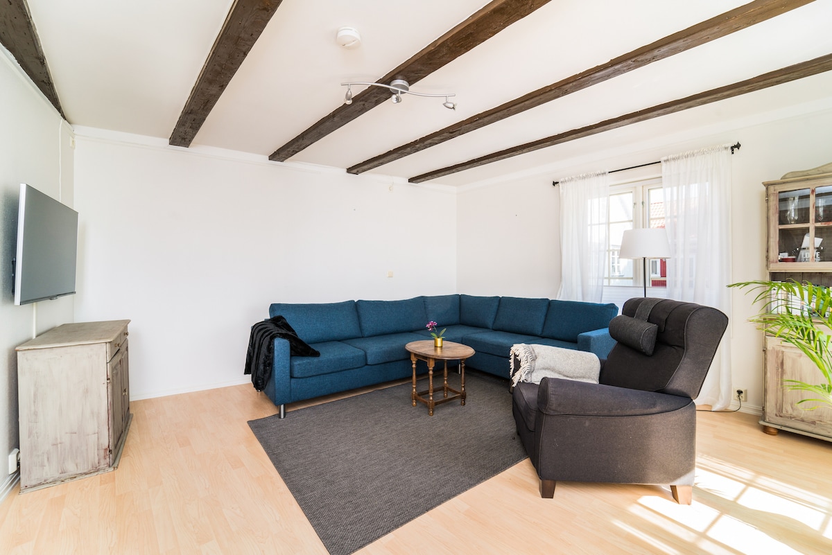 Koselig, fredelig leilighet fra 1850, fullt utstyrt med alle moderne bekvemmeligheter. Tilgang til felles, usjenert hage, med hagemøbler. Gratis wifi, kjæledyr tillatt, 3 min gange til offentlig sandstrand og brygge m stupebrett/fiskemuligheter. Unikt område med gamle trehus, bakeri, fiskebutikk, kolonial og bensinstasjon rett ved. Gratis gateparkering. Gangavstand til Color Line terminal samt togstasjon Larvik sentrum.