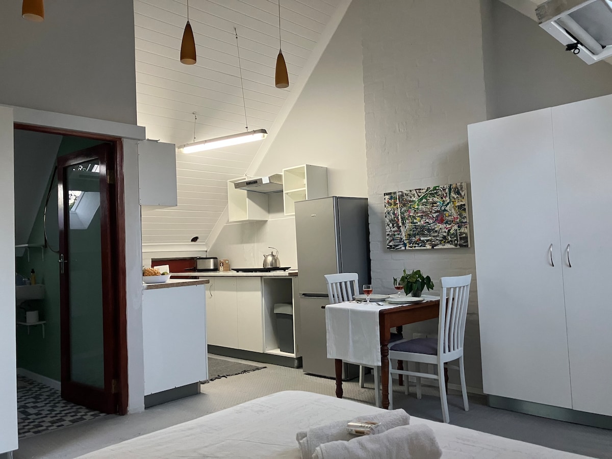 A tranquil indoor-outdoor living space ideal for couples or business travelers. The stylish studio opens up onto a large patio with braai. Enjoy our long summers outdoors! The studio has a separate entrance from the main house. Queen bed with open walk-in shower & separate toilette . It has fiber WI-FI, full DSTV, a tiny kitchenette with tea/coffee facilities, toaster, microwave, fridge & single induction plate. Secure onsite parking. We have 2 Small dogs for added security.