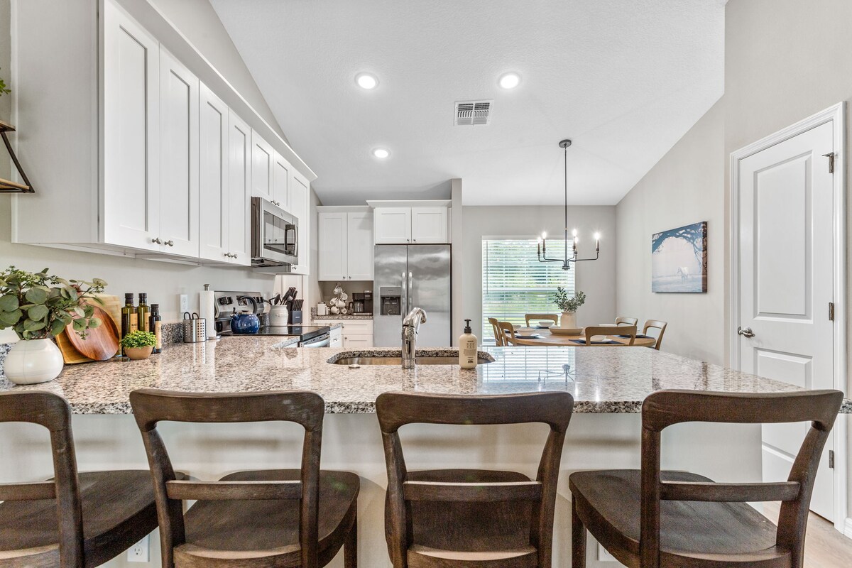 The Horsey Hideaway offers a brand-new, professionally decorated 4-bedroom, 2-bathroom home just 2 blocks to "The Villages ". and short drive to the World Equestrian Center! Features include: 4 Spacious Bedrooms -Luxurious primary king size bed /ensuite, 2 bedrooms - queen size beds and the fourth bedroom-twins. New Samsung smart TVs in each. Well-Equipped Kitchen with eat in dining Outdoor Fun: The fenced backyard, great for kids to play. A 7-person hot tub.. See rules on quite hours!