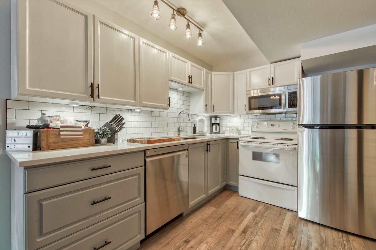 享受我們乾淨、新翻修的主樓1間臥室、1間浴室、600平方英尺的公寓。從後門滑雪進入,步行穿過安靜的街道,滑雪到村莊的主要電梯。步行不到5分鐘即可抵達村莊,包括街對面的全新NHL大小溜冰場。距離村莊和電梯最近的公寓之一。滑雪到後門,將滑雪板鎖在後面的儲物櫃中。公寓有全套洗衣設施、瓦斯壁爐、指定停車位。*如果您需要2間1間臥室公寓,請查看我們的其他主樓單位17 w熱水浴缸*