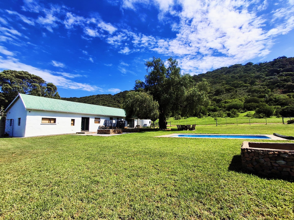 Experience the perfect blend of nature and comfort with your own swimming pool at our small family farm. You'll be surrounded by wild peacocks, free-range chickens and donkeys. Plus: - FREE 28-Page Garden Route Travel Guide - When you book with us, you’ll receive our exclusive Travel Guide full of hidden gems, activities, national parks, and extra safety and travel tips for your journey. - Homemade Breakfast Incl. - 2min Drive to 1# ranked Beach in Town - 1min Drive to Golf Club with Zebra's