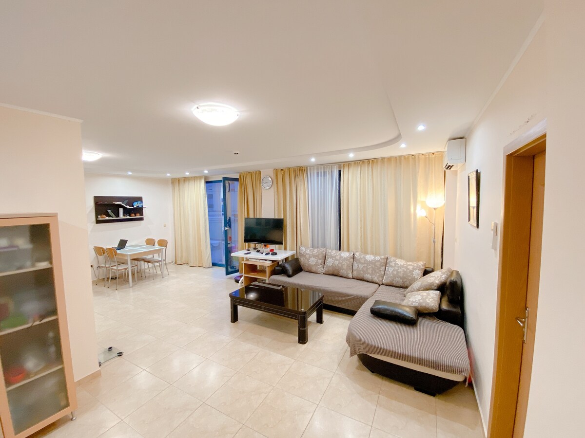 距離大海和最受歡迎的可可海灘300米。 靠近市中心和Nessebar。 附近有商店和餐廳、巴士站、巴士站、車站。 非常棒的水療和健身中心。 時尚餐廳:一樓-菜單上有酒吧和餐廳,二樓-全包式餐廳,每天僅需15歐元。 早餐費用為3.5歐元。 公寓的窗戶位於僻靜的街道上,而不是泳池,所以您可以睡個好覺!