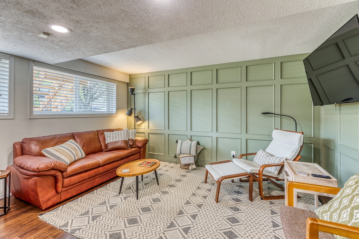 如果您正在尋找寬敞而舒適的度假屋,我們的房子提供一切:寬敞的臥室、巨大的後院和獨家遊戲室! 🖥舒適的客廳,配有高品質沙發, 55吋電視,可收看Netflix ! 🎮 令人興奮的遊戲室,配有PACMAN、Foosball和30多個桌上遊戲! 鳥鳴的🌲寧靜後院露台🐦 🛏 乾淨優質的牀鋪,讓您睡個好覺 ☕️ 專屬咖啡站 🚗 寬敞的停車位 設🌯備齊全的廚房 步行即可抵達的🛒雜貨店