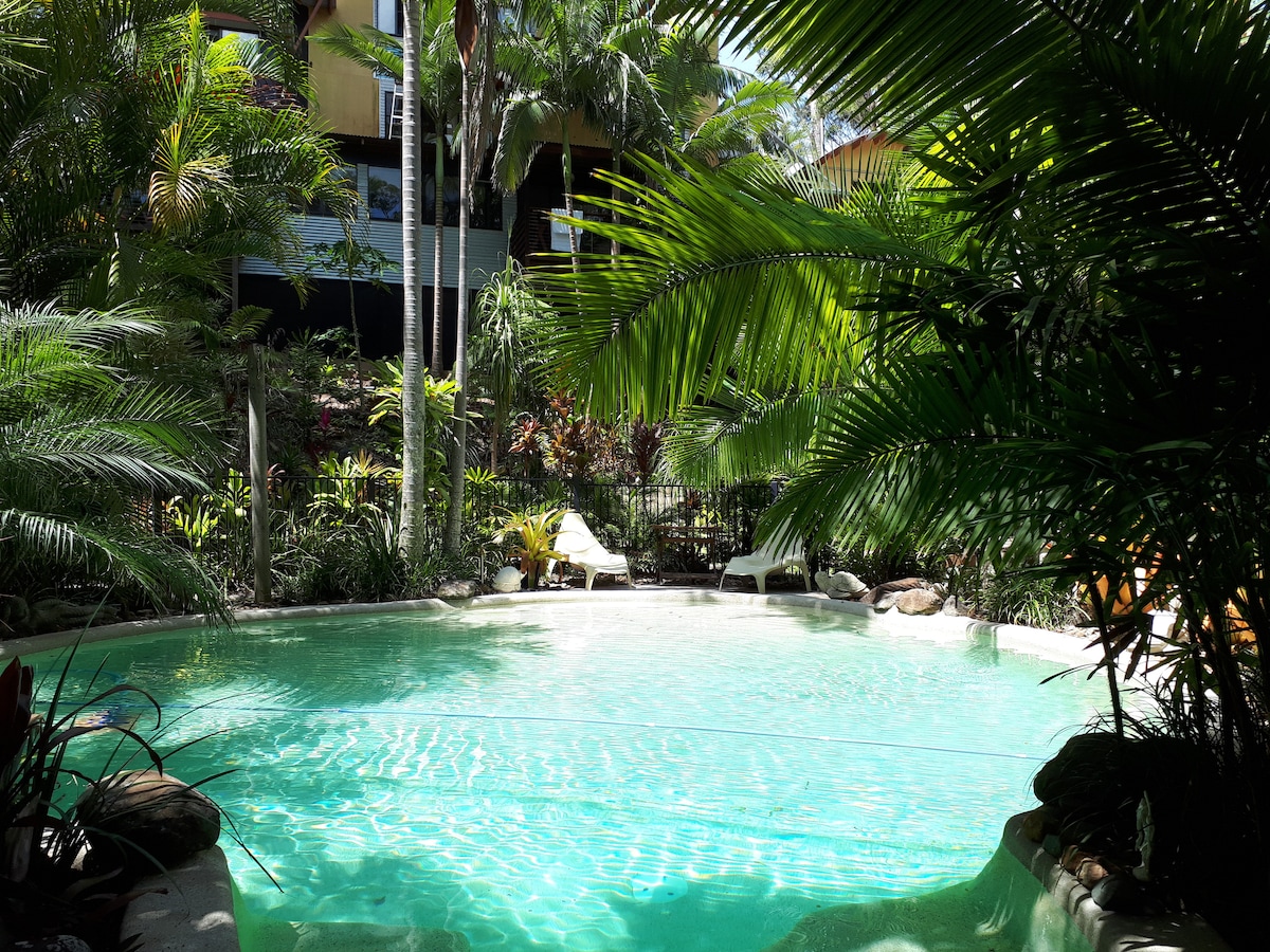 Nestled in the rainforest, in this cosy place you’ll wake up to amazing birdsong… It’s close to great restaurants, shopping plazas, movies, beaches, bush walks. Home baked sourdough bread and continental breakfast. Shared kitchen, dining and living areas. An outdoor garden patio with lawn and rainforest backdrop. Upstairs double bedroom and private bathroom. Free parking Non smoking / vaping please. My small, quiet cavoodle is in residence! Coco is low allergenic and does not shed.