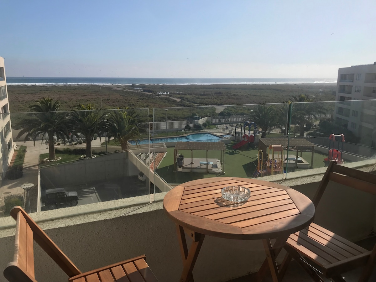 公寓設備齊全。公寓有烤肉區、停車場和游泳池。 公寓位於 Lider 超市前面(步行 2 分鐘) 步行 15 分鐘即可抵達巴士總站和 La Serena 購物中心。 距離燈塔和海濱大道 2 公里。 Puertas del Mar 區域靠近景點,是度假的理想之地。這是一個安靜且安全的區域。