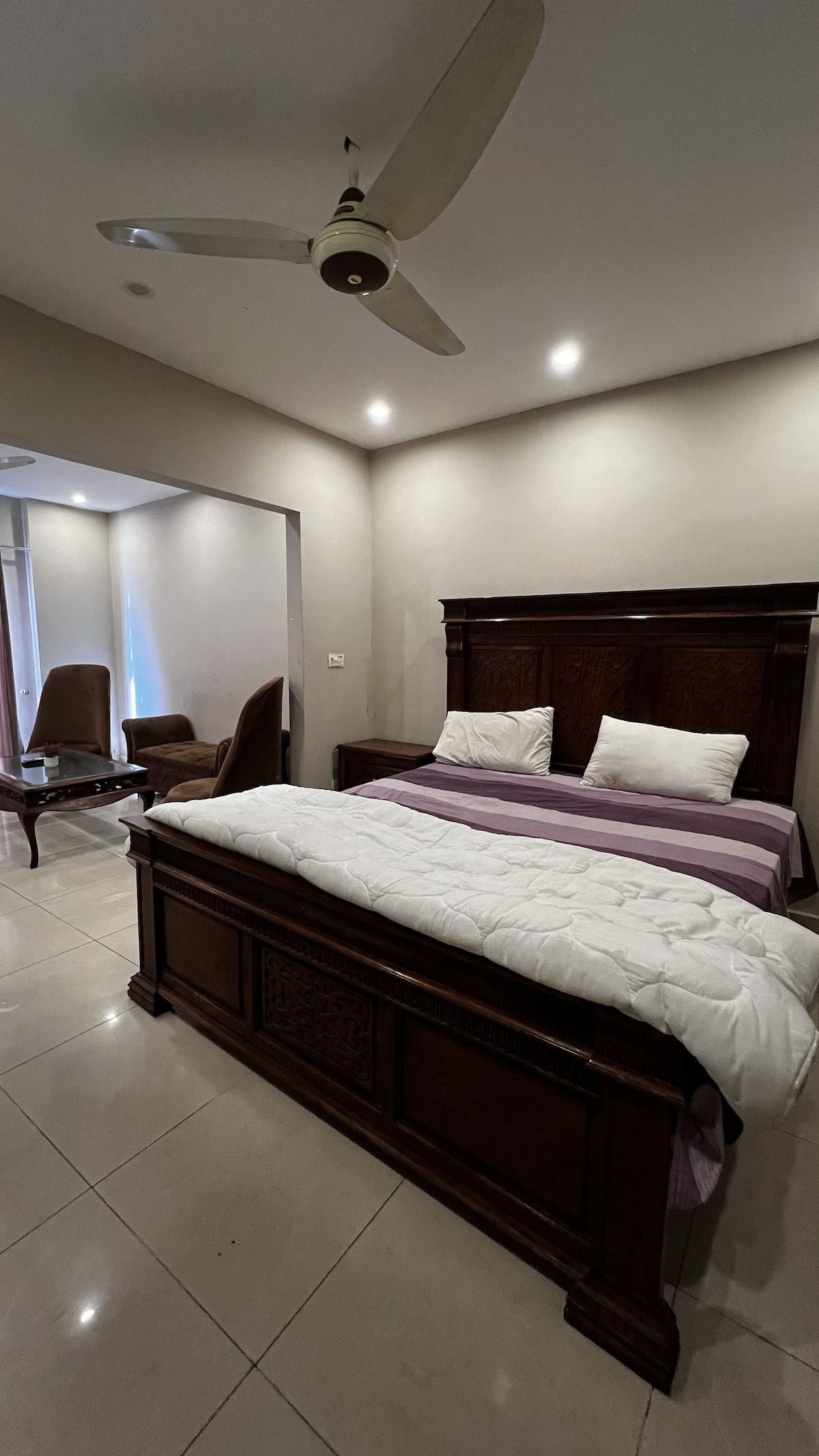 Spacious 1 Kanal luxury home with 6000+ sq. ft. covered area. Features 4 en-suite bedrooms, 2 fully equipped kitchens, large private garden, and cozy TV lounge. Ideal for families or groups seeking comfort and privacy. Housemaid available on request. Peaceful, secure location — perfect for short or long stays. 20 minutes from McDonald, V Mall and other Restaurants.