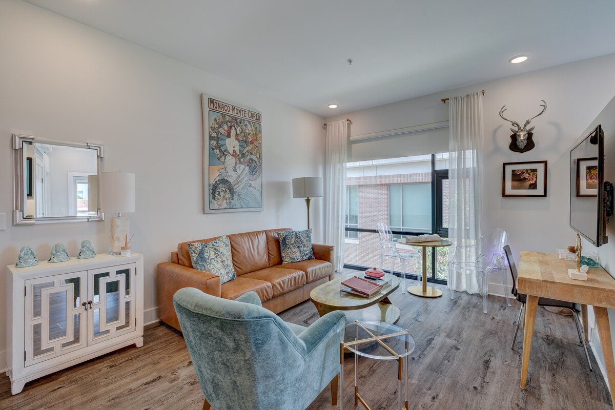 This luxury king suite has large windows, visually captivating decor and original art, high ceilings, a beautiful full kitchen with quartz countertops and stainless steel appliances, comfortable living room and dining area, a large walk-in shower, and luxury linens. Together, the hip decor and art transform this suite into a visually captivating and engaging space to relax, providing guests with an immersive and memorable experience that goes beyond mere accommodation.