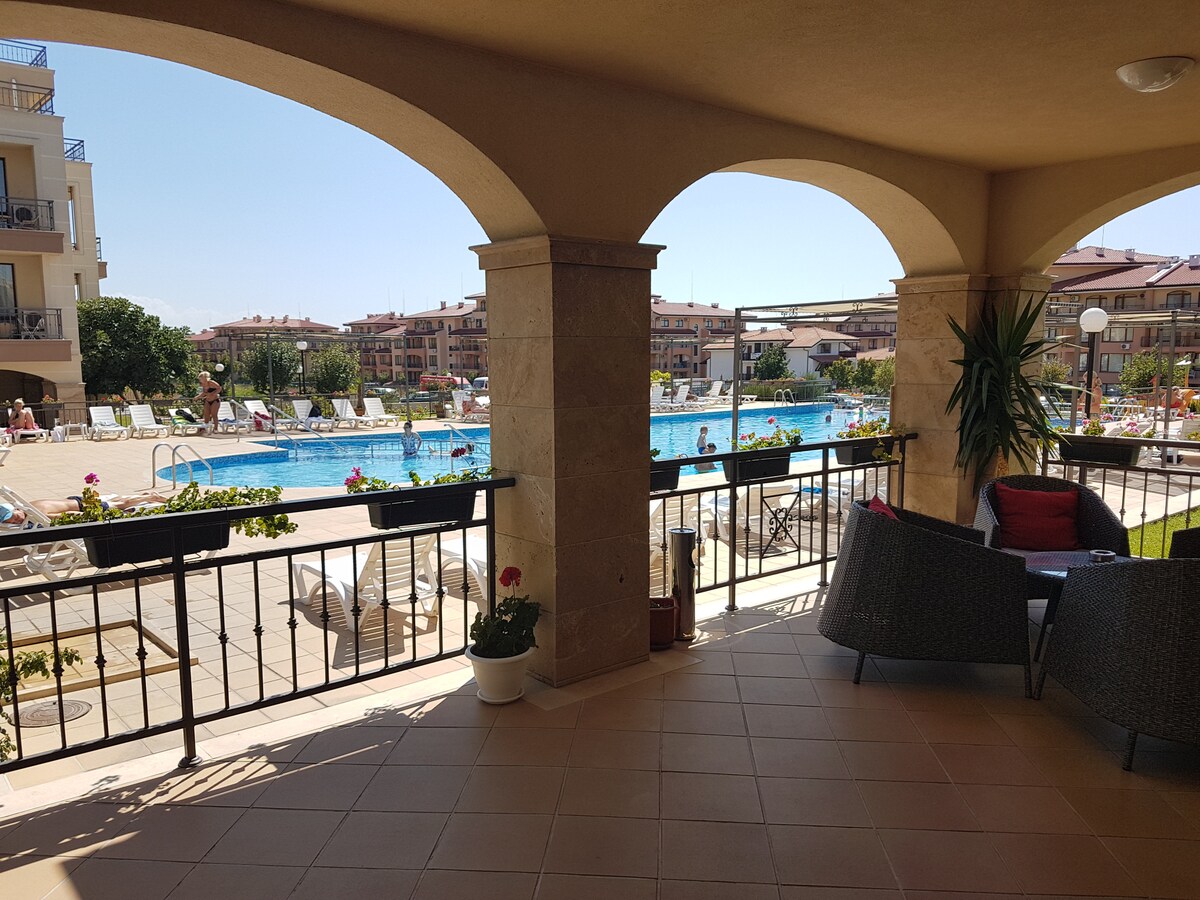 舒適的單間公寓,配有Wi-Fi和冷氣! 🌴 公寓提供Wi-Fi、冷氣、2間餐廳、2間商店,以及17個戶外泳池的花園。 該地區非常適合在Stara Planina山脈徒步旅行、潛水或迷你高爾夫球。 室內有有線電視和Netflix。 小廚房包括微波爐、雪櫃、烤麵包機、水壺和咖啡機,浴室配有洗衣機和吹風機。