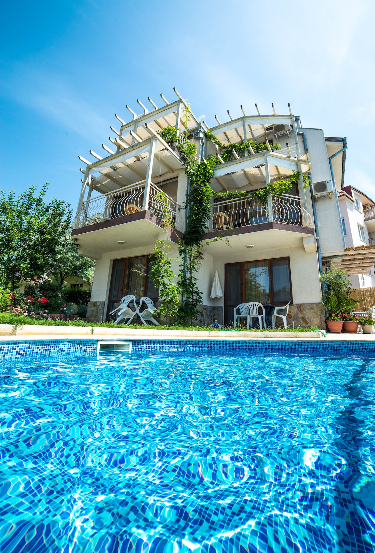 歡迎來到我們位於Sveti Vlas和Sunny Beach之間的時尚公寓,步行5分鐘即可抵達該地區最好的海灘。 我們的公寓設有寬敞的睡房、客廳、廚房和美麗的露台,距離泳池僅幾步之遙。 Melodie complex位於以治療氣流而聞名的地區。 您需要的一切都在這裡: -所有房間都有冷氣 - WIFI -泳池 -停車位 -花園 超市 -大眾交通工具 -靠近餐廳/海灘 -海灘景點
