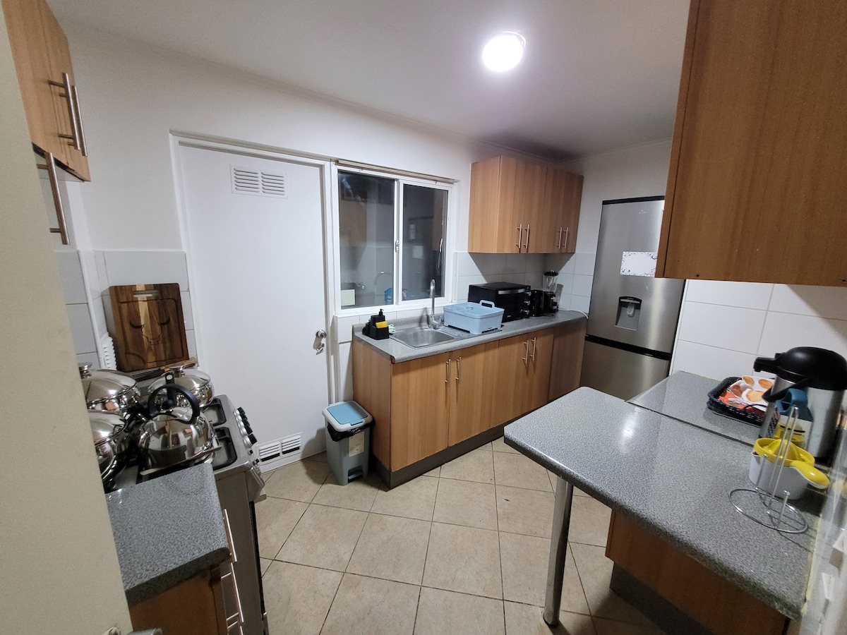 Casa completa y céntrica en Talca, a 2 cuadras de la Alameda y 3 de la Diagonal. Ideal para 4 huéspedes: 2 dormitorios (matrimonial y dos individuales), 1 baño, living-comedor y cocina exclusiva equipada con refrigerador y otros. Wi-Fi y TV en dormitorio principal. Incluye ropa de cama y toallas. Estacionamiento privado dentro de la propiedad. Pet-friendly. No se permite fumar en interiores.