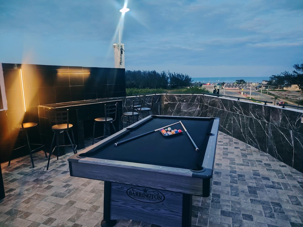 EL NAVEGANTE PLAYA MIRAMAR酒店內的半套房,可容納2人,配有1張特大床、迷你吧、微波爐、咖啡機、Wi-Fi、智能電視、停車位、公共大堂的街機撞球桌、露台,配有燒烤和海景,步行5分鐘即可抵達Oxxo海灘,Oxxo就在前面。抵達時,我們會要求支付200美元的押金,在退房時檢查房間後退還