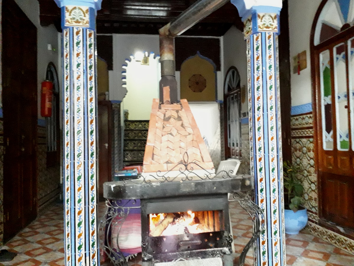 在我們的露臺房間體驗寧靜,俯瞰藍色城市和山脈。 在這片寧靜的綠洲中放鬆身心,欣賞迷人的城市景觀。 在傳統的摩洛哥環境中享受現代舒適。 非常適合您入住舍夫沙萬期間的寧靜度假。 非常適合情侶入住