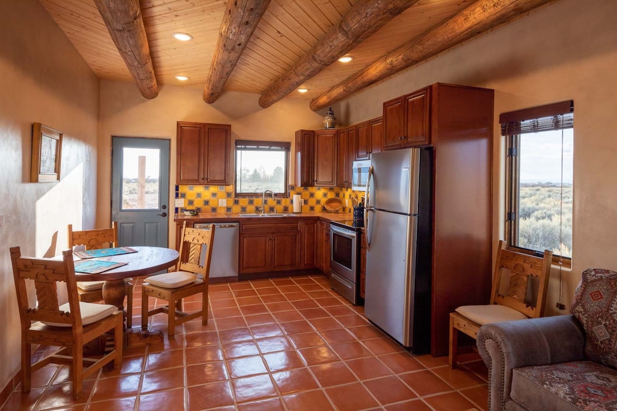 景觀迷人、安靜,靠近滑雪場和廣場 走進具有溫馨西南魅力的正宗土磚屋,在寧靜中放鬆身心。這間新翻修的客用住房有高Viga天花板、kiva壁爐、加熱的satillo瓷磚地板和當地Taos工匠製作的木製家具。位於1.5英畝的土地上,毗鄰無盡的普韋布洛土地,從私人樓上露臺和樓下甲板上欣賞壯麗的山景。 距離市中心僅10分鐘,距離陶斯滑雪谷(Taos Ski Valley)僅20分鐘。