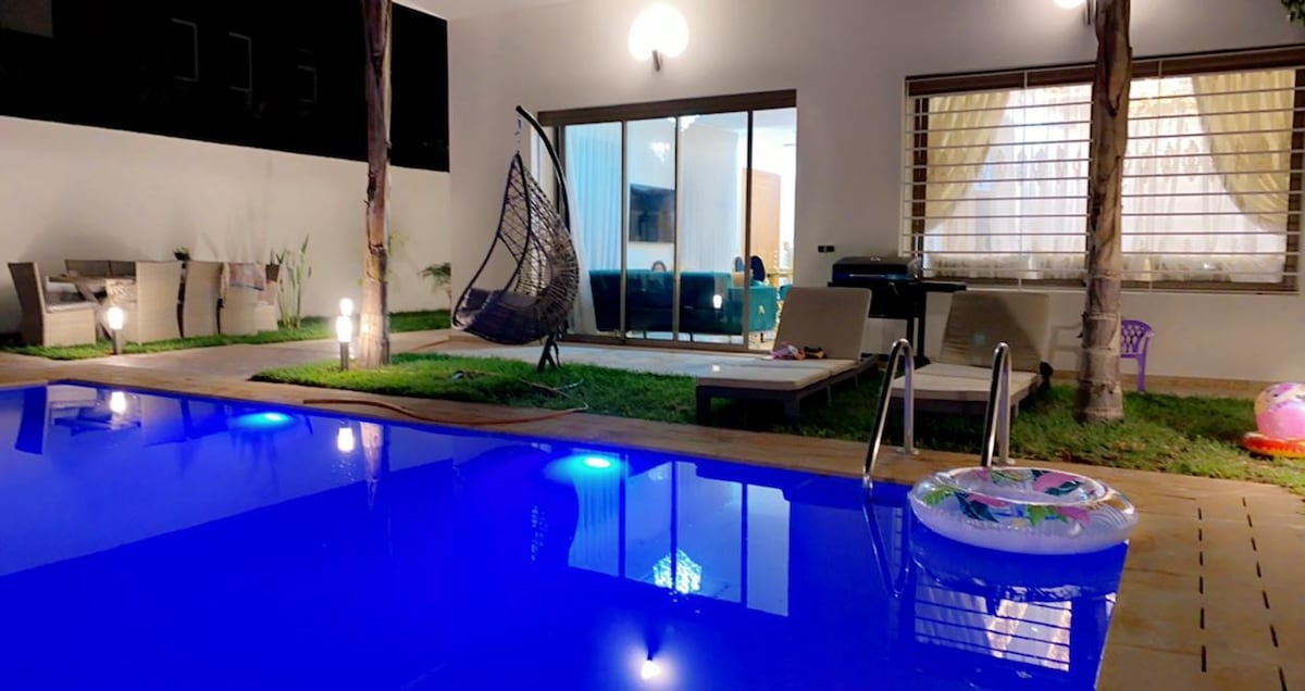 Située au quartier bien convoité de Targa, cette villa sur 2 niveaux, réservée aux familles, ultra équipée,ensoleillée et spacieuse vous plonge dans une ambiance chic et chaleureuse.A une minute,il ya une station de bus pour la place Jamaa Lefna et le centre ville. tout près,plein de magasins: supermarché, boulangerie, des cafés, restaurants et pizzerias vous apprécierez la piscine et l'immense terrasse de la maison ( solarium et jeux enfants) Le transfert aéroport et le petit-déj sont offerts