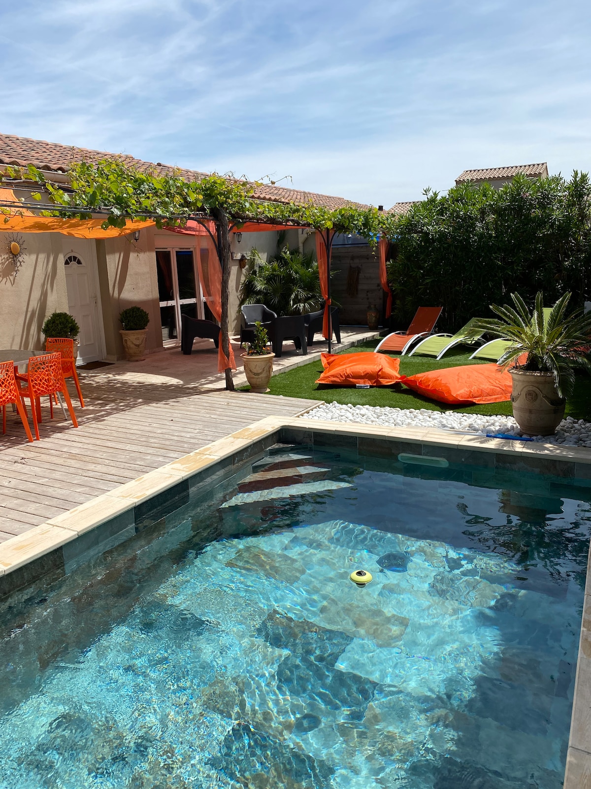 石造的正宗普羅旺斯別墅,現代舒適。 地理位置優越,開車前往Avignon中心僅需5分鐘,步行25分鐘即可抵達。 這個區域非常安靜。 有20平方米的露台、大客廳、3間臥室、花園和泳池。 我們在5月1日開放泳池,並在11月1日關閉。 泳池是與我們共用,只有一個別墅,我們不會侵入您的空間:)
