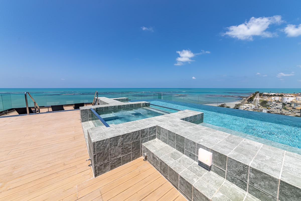 在馬塞約(Maceió)醒來,欣賞無盡的海景! 無與倫比的位置!我們距離新的馬塞約摩天輪僅幾步之遙! 雙腳踏在沙灘上,面對天然泳池、工藝館和很棒的餐廳。 配有大床、設備齊全的廚房和海景陽台的單間公寓。 公寓,屋頂設有無邊際泳池、桑拿、健身中心、遊戲室和水療中心。